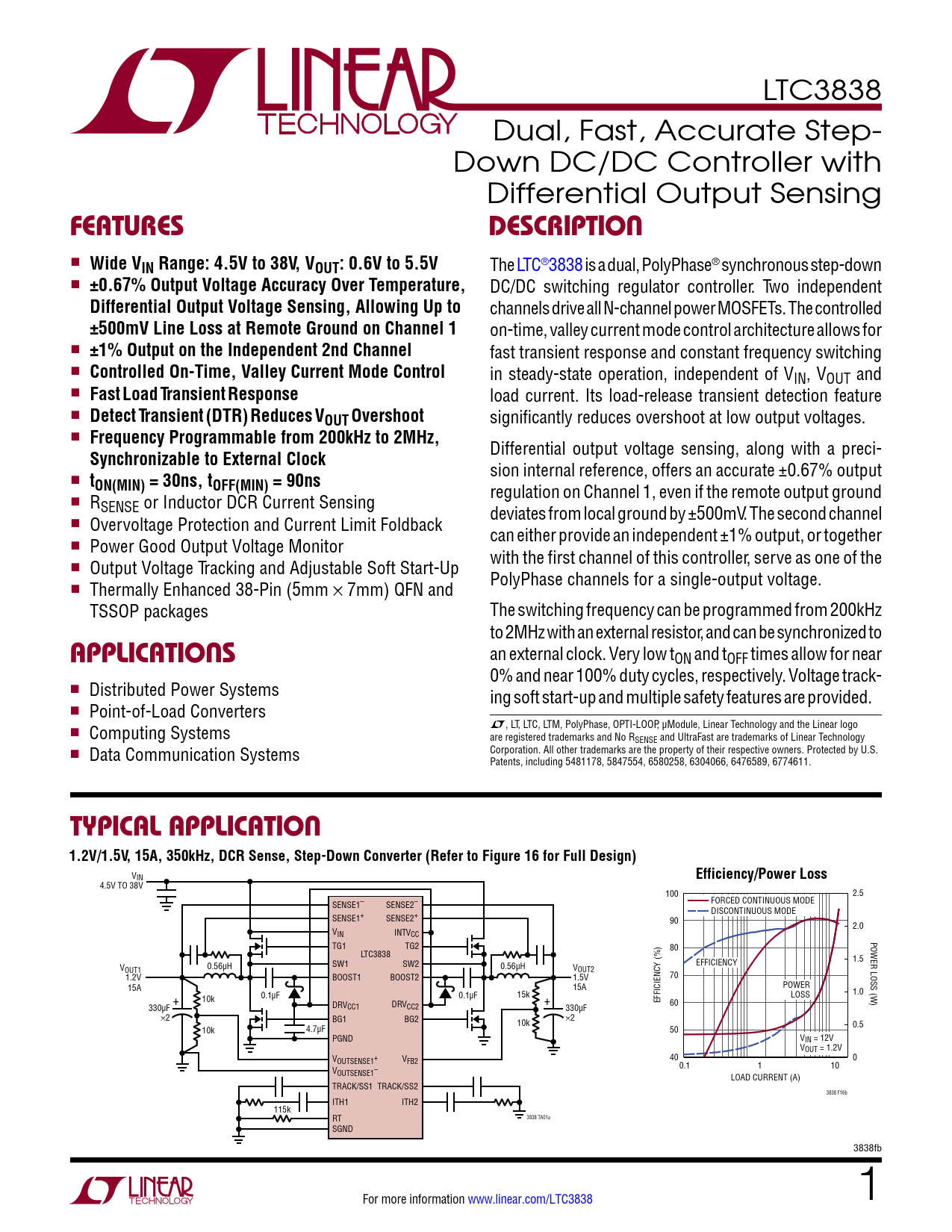 LTC3838 Dual, Fast, Accurate Step- Down DC/DC Controller with Differential Output Sensing FeaTuresDescripTion n Wide VIN Range: 4.5V to 38V, VOUT: 0.6V to 5.5V The LTC®3838 is a dual, PolyPhase® synchronous step-down n ±0.67% Output Voltage Accuracy Over Temperature, DC/DC switching regulator controller. Two independent Differential Output Voltage Sensing, Allowing Up to channels drive all N-channel power MOSFETs. The controlled ±500mV Line Loss at Remote Ground on Channel 1 on-time, valley current mode control architecture allows for n ±1% Output on the Independent 2nd Channel fast transient response and constant frequency switching n Controlled On-Time, Valley Current Mode Control in steady-state operation, independent of VIN, VOUT and n Fast Load Transient Response load current. Its load-release transient detection feature n Detect Transient (DTR) Reduces VOUT Overshoot significantly reduces overshoot at low output voltages. n Frequency Programmable from 200kHz to 2MHz, Differential output voltage sensing, along with a preci- Synchronizable to External Clock sion internal reference, offers an accurate ±0.67% output n tON(MIN) = 30ns, tOFF(MIN) = 90ns regulation on Channel 1, even if the remote output ground n RSENSE or Inductor DCR Current Sensing deviates from local ground by ±500mV. The second channel n Overvoltage Protection and Current Limit Foldback can either provide an independent ±1% output, or together n Power Good Output Voltage Monitor with the first channel of this controller, serve as one of the n Output Voltage Tracking and Adjustable Soft Start-Up PolyPhase channels for a single-output voltage. n Thermally Enhanced 38-Pin (5mm × 7mm) QFN and TSSOP packages The switching frequency can be programmed from 200kHz to 2MHz with an external resistor, and can be synchronized to applicaTions an external clock. Very low tON and tOFF times allow for near 0% and near 100% duty cycles, respectively. Voltage track- n Distributed Power Systems ing soft start-up and multiple safety features are provided. n Point-of-Load Converters L, LT, LTC, LTM, PolyPhase, OPTI-LOOP, µModule, Linear Technology and the Linear logo n Computing Systems are registered trademarks and No RSENSE and UltraFast are trademarks of Linear Technology Corporation. All other trademarks are the property of their respective owners. Protected by U.S. n Data Communication Systems Patents, including 5481178, 5847554, 6580258, 6304066, 6476589, 6774611. Typical applicaTion1.2V/1.5V, 15A, 350kHz, DCR Sense, Step-Down Converter (Refer to Figure 16 for Full Design) V Efficiency/Power Loss IN 4.5V TO 38V 100 2.5 SENSE1– SENSE2– FORCED CONTINUOUS MODE DISCONTINUOUS MODE SENSE1+ SENSE2+ 90 2.0 VIN INTVCC POWER LOSS (W) TG1 TG2 80 LTC3838 EFFICIENCY 1.5 V 0.56µH SW1 SW2 0.56µH V OUT1 OUT2 1.2V BOOST1 BOOST2 1.5V 70 15A 15A POWER 0.1µF 0.1µF 1.0 10k 15k + LOSS DRV + EFFICIENCY (%) 330µF CC1 DRVCC2 330µF 60 ×2 BG1 BG2 ×2 10k 0.5 10k 4.7µF 50 PGND VIN = 12V VOUT = 1.2V VOUTSENSE1+ VFB2 40 0 V 0.1 1 10 OUTSENSE1– LOAD CURRENT (A) TRACK/SS1 TRACK/SS2 3838 F16b ITH1 ITH2 115k 3838 TA01a RT SGND 3838fb For more information www.linear.com/LTC3838 1 Document Outline Features Applications Description Typical Application Absolute Maximum Ratings Pin Configuration Electrical Characteristics Typical Performance Characteristics Pin Functions Functional Diagram Operation Typical Applications Package Description Revision History Typical Application Related Parts