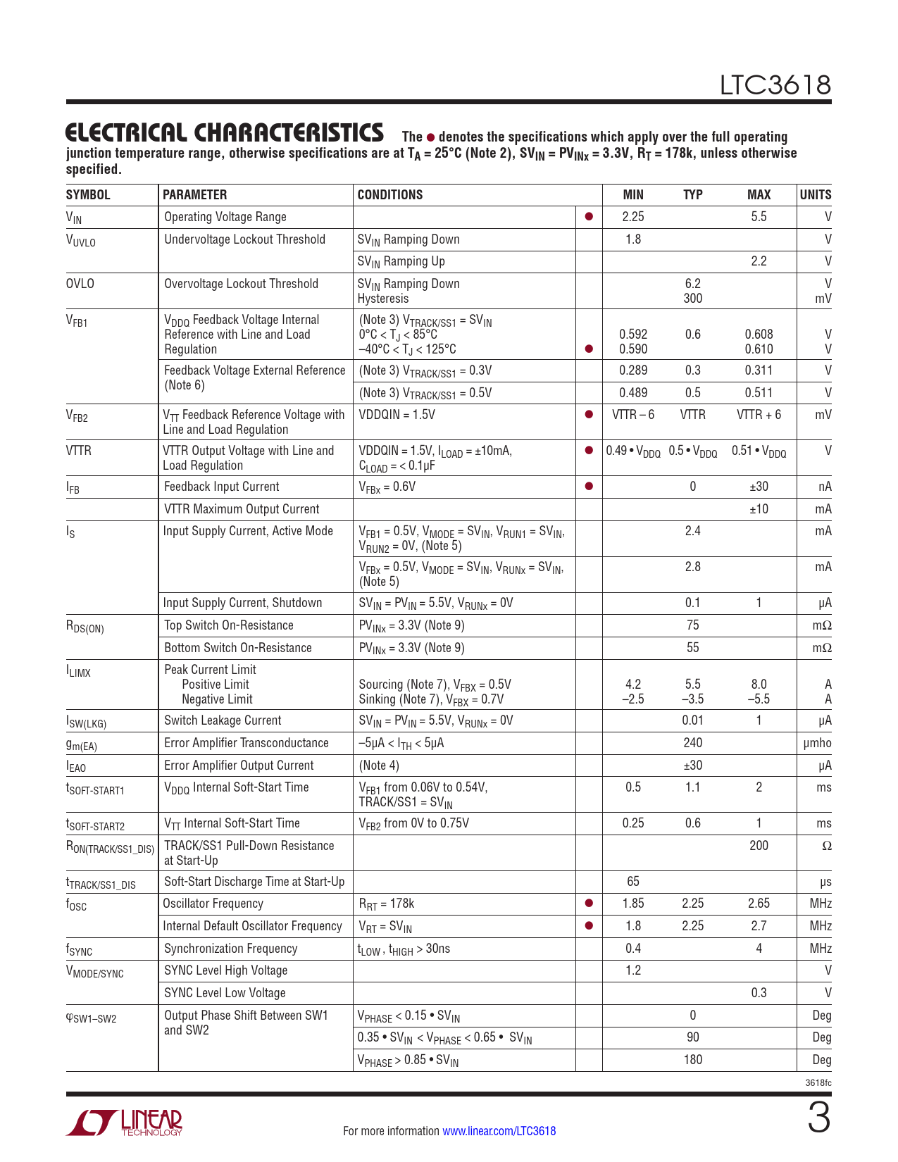 denotes the specifications which apply over the full operating junction temperature range, otherwise specifications are at TA = 25°C (Note 2), SVIN = PVINx = 3.3V, RT = 178k, unless otherwise specified. SYMBOL PARAMETER CONDITIONS MIN TYP MAX UNITS