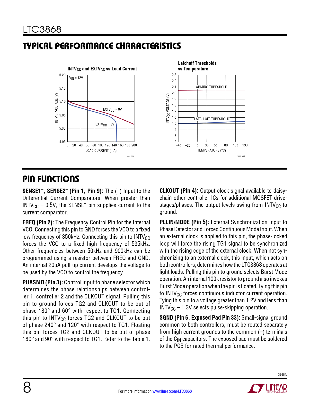 5.20 2.3 VIN = 12V 2.2 5.15 2.1 ARMING THRESHOLD 2.0 5.10 1.9 1.8 VOLTAGE (V) EXTVCC = 0V VOLTAGE (V) 1.7 CC 5.05 CC 1.6 LATCH-OFF THRESHOLD INTV INTV EXTVCC = 8V 1.5 5.00 1.4 1.3 4.95 1.2 0 20 40 60 80 100 120 140 160 180 200 –45 –20 5 30 55 80 105 130 LOAD CURRENT (mA) TEMPERATURE (°C) 3868 G26 3868 G27