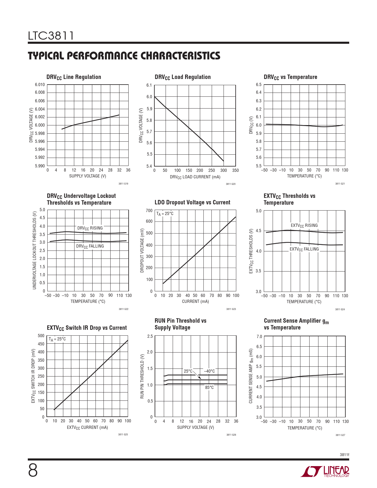 500 2.5 7.0 TA = 25°C 450 6.5 400 2.0 (mS) 6.0 350 m 300 5.5 1.5 25°C –40°C 250 5.0 200 1.0 SWITCH IR DROP (mV) 85°C 4.5 CC 150 V RUN PIN THRESHOLD (V) 4.0 EXT 100 0.5 CURRENT SENSE AMP g 50 3.5 0 0 3.0 0 10 20 30 40 50 60 70 80 90 100 0 4 8 12 16 20 24 28 32 36 –50 –30 –10 10 30 50 70 90 110 130 EXTVCC CURRENT (mA) SUPPLY VOLTAGE (V) TEMPERATURE (°C) 3811 G25 3811 G26 3811 G27 3811f 8