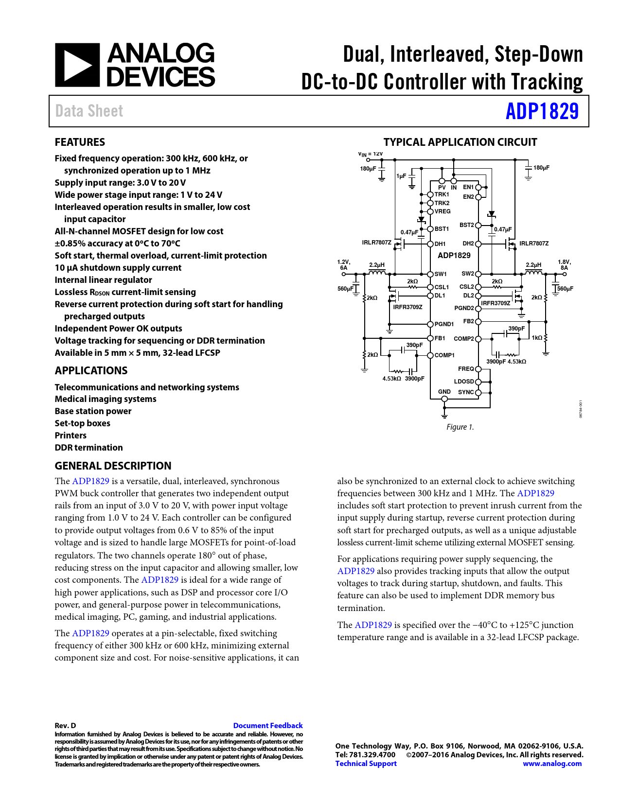 Dual, Interleaved, Step-Down. DC-to-DC Control er with Tracking. Data Sheet. ADP1829. FEATURES. TYPICAL APPLICATION CIRCUIT