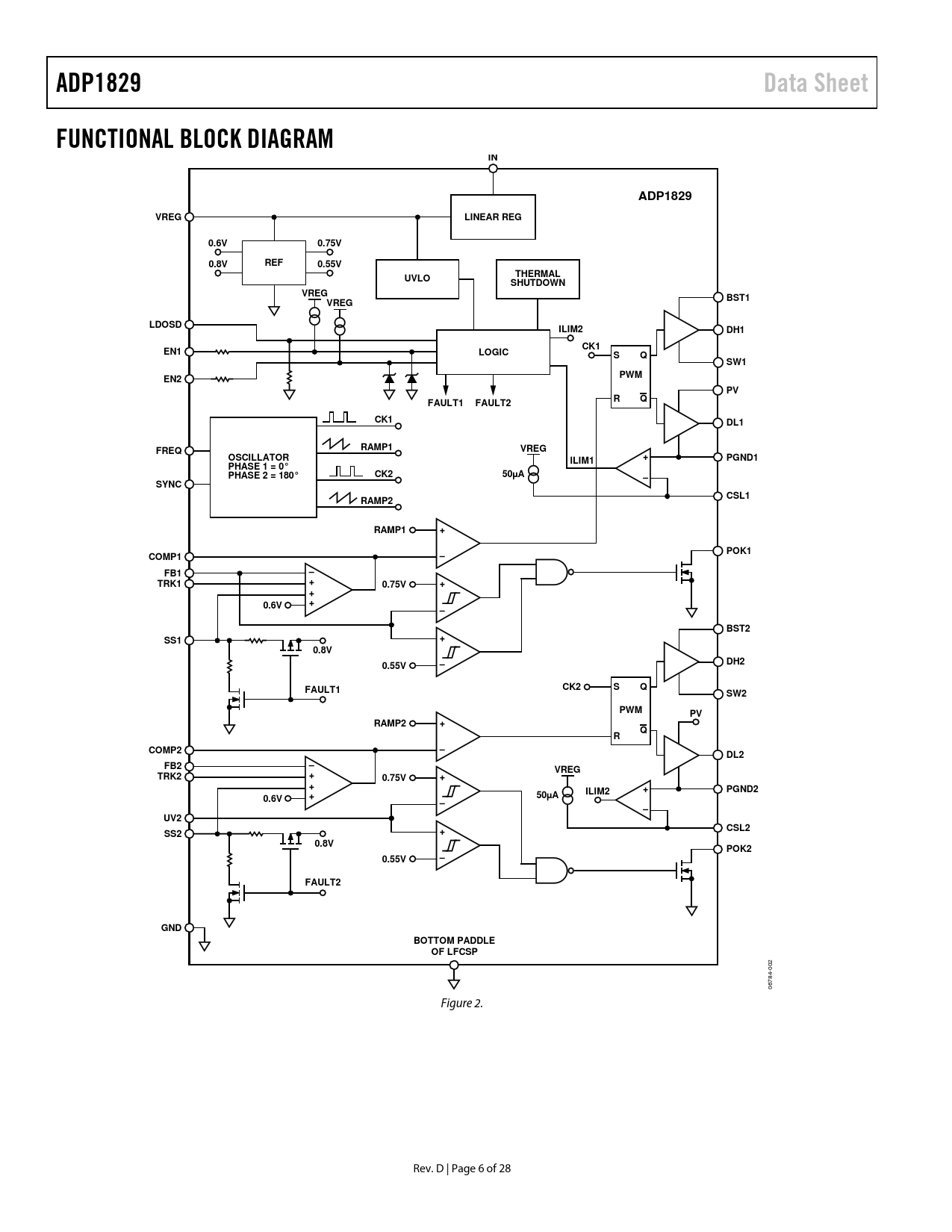 ADP1829. Data Sheet. FUNCTIONAL BLOCK DIAGRAM. VREG. LINEAR REG. 0.6V. 0.75V. 0.8V. REF. 0.55V. THERMAL. UVLO. SHUTDOWN. BST1. LDOSD. ILIM2. DH1. CK1. EN1