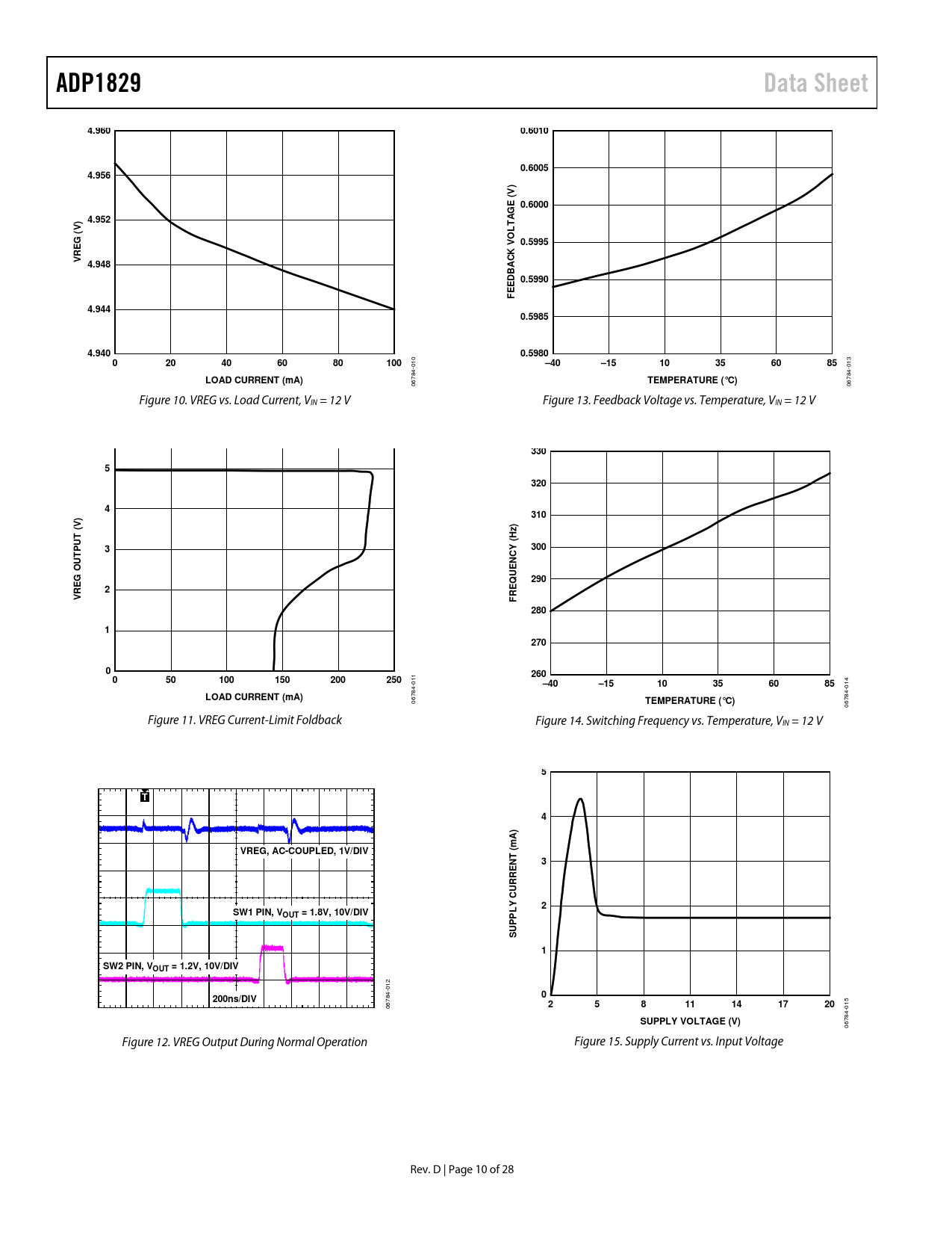 ADP1829Data Sheet4.9600.60100.60054.956) V ( E 0.60004.952AG T L(V)O 0.5995EG VR 4.948DBACK V 0.5990E E F4.9440.59854.9400.5980020406080100 010 –40–1510356085 013 LOAD CURRENT (mA)TEMPERATURE (°C) 06784- 06784- Figure 10. VREG vs. Load Current, VIN = 12 V Figure 13. Feedback Voltage vs. Temperature, VIN = 12 V 33053204310)(V) THz (PU3300T UNCYOUE290EGQ2VRRE F28012700260050100150200250 011 –40–1510356085 014 LOAD CURRENT (mA) 06784- TEMPERATURE (°C) 06784- Figure 11. VREG Current-Limit Foldback Figure 14. Switching Frequency vs. Temperature, VIN = 12 V 5T4mA)VREG, AC-COUPLED, 1V/DIV( NT3CURRE Y2SW1 PIN, VLOUT = 1.8V, 10V/DIVP UP S1SW2 PIN, VOUT = 1.2V, 10V/DIV 012 200ns/DIV0 06784- 25811141720 015 SUPPLY VOLTAGE (V) 06784- Figure 12. VREG Output During Normal Operation Figure 15. Supply Current vs. Input Voltage Rev. D | Page 10 of 28 Document Outline FEATURES APPLICATIONS TYPICAL APPLICATION CIRCUIT GENERAL DESCRIPTION TABLE OF CONTENTS REVISION HISTORY SPECIFICATIONS ABSOLUTE MAXIMUM RATINGS ESD CAUTION FUNCTIONAL BLOCK DIAGRAM PIN CONFIGURATION AND FUNCTION DESCRIPTIONS TYPICAL PERFORMANCE CHARACTERISTICS THEORY OF OPERATION INPUT POWER START-UP LOGIC INTERNAL LINEAR REGULATOR OSCILLATOR AND SYNCHRONIZATION ERROR AMPLIFIER SOFT START POWER OK INDICATOR TRACKING MOSFET DRIVERS CURRENT LIMIT APPLICATIONS INFORMATION SELECTING THE INPUT CAPACITOR Selecting the Output LC Filter SELECTING THE MOSFETS SETTING THE CURRENT LIMIT FEEDBACK VOLTAGE DIVIDER COMPENSATING THE VOLTAGE MODE BUCK REGULATOR Type II Compensator Type III Compensator SOFT START VOLTAGE TRACKING COINCIDENT TRACKING RATIOMETRIC TRACKING Setting the Channel 2 Undervoltage Threshold for Ratiometric Tracking THERMAL CONSIDERATIONS PCB LAYOUT GUIDELINES LFCSP PACKAGE CONSIDERATIONS APPLICATION CIRCUITS OUTLINE DIMENSIONS ORDERING GUIDE