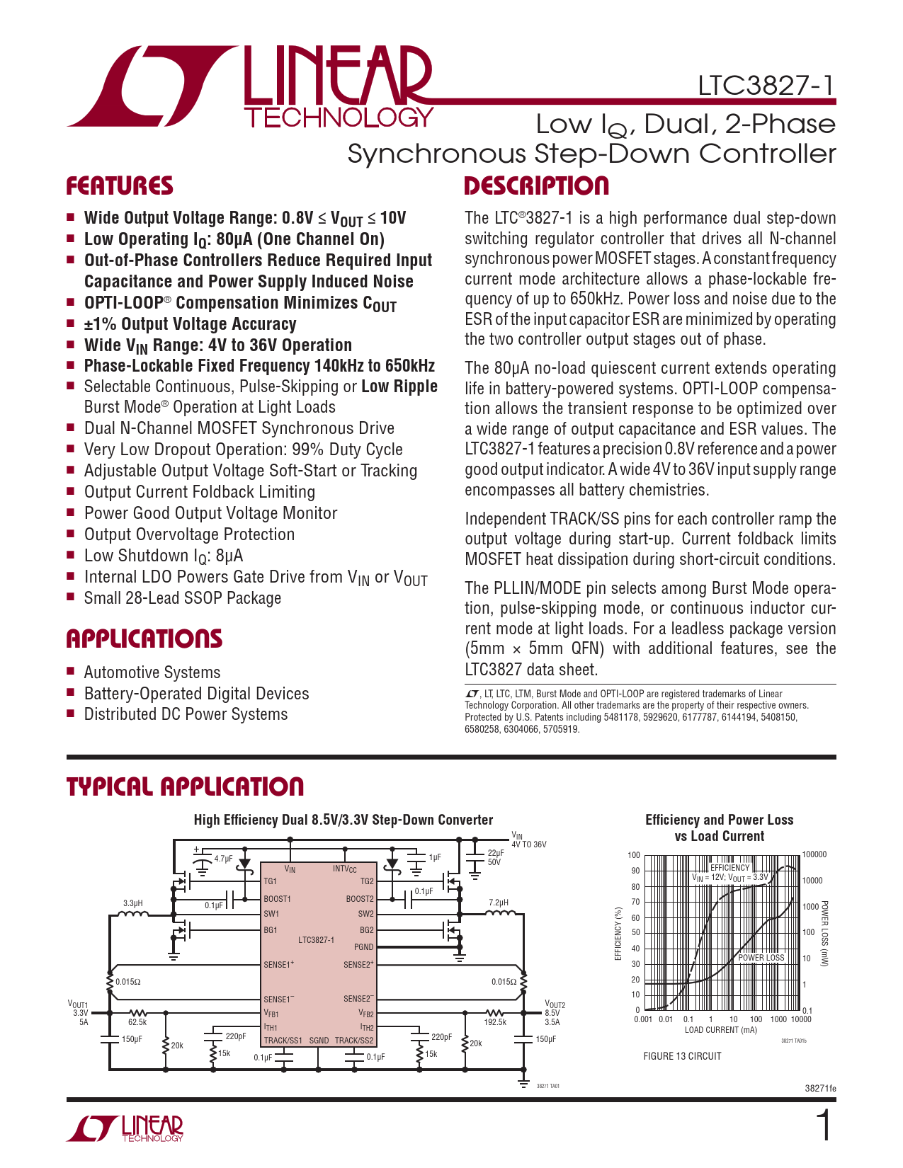 rent mode at light loads. For a leadless package version (5mm × 5mm QFN) with additional features, see the n Automotive Systems LTC3827 data sheet. n Battery-Operated Digital Devices L, LT, LTC, LTM, Burst Mode and OPTI-LOOP are registered trademarks of Linear n Technology Corporation. All other trademarks are the property of their respective owners. Distributed DC Power Systems Protected by U.S. Patents including 5481178, 5929620, 6177787, 6144194, 5408150, 6580258, 6304066, 5705919.