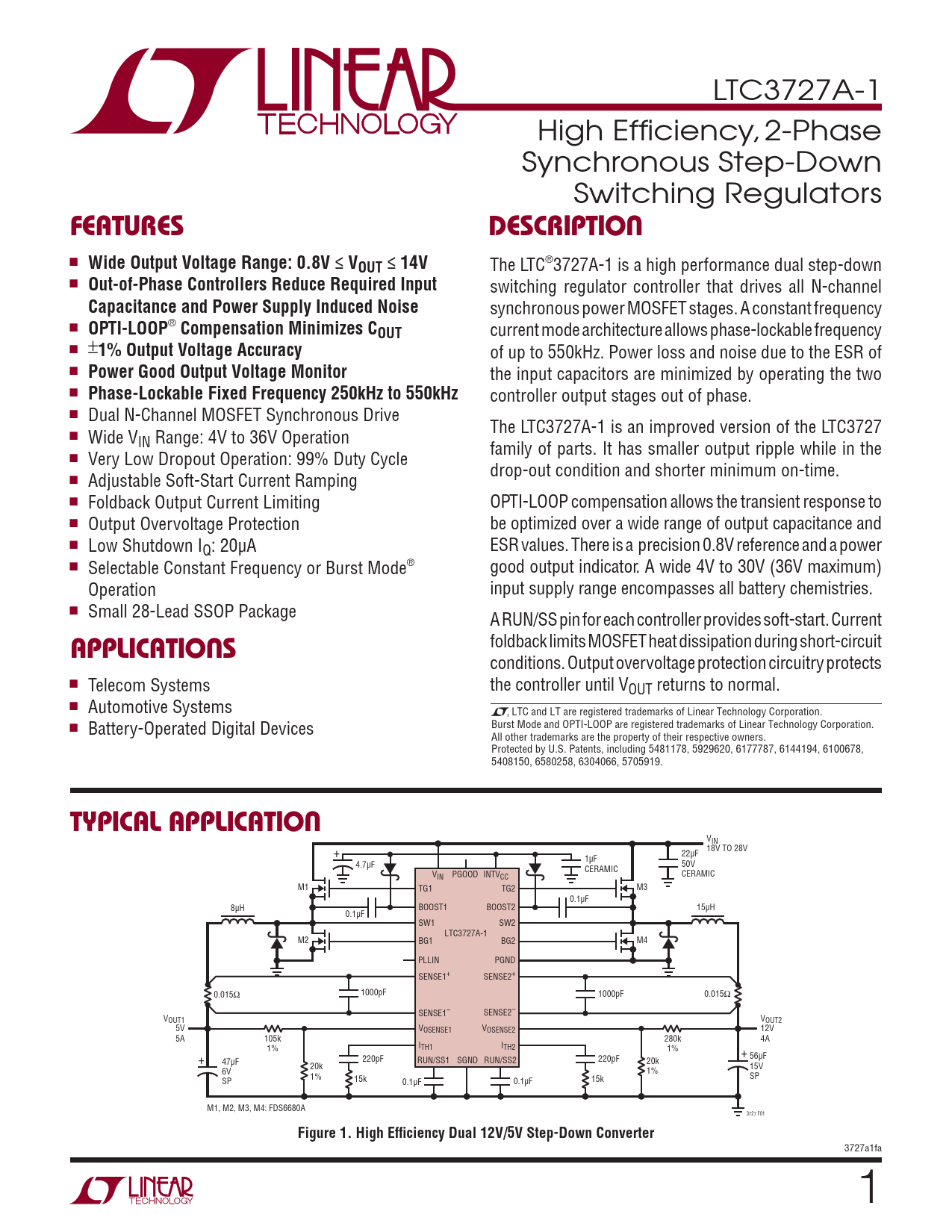 VIN + 18V TO 28V 22μF 1μF 4.7μF 50V CERAMIC V CERAMIC IN PGOOD INTVCC M1 TG1 TG2 M3 0.1μF 8μH BOOST1 BOOST2 15μH 0.1μF SW1 SW2 LTC3727A-1 M2 BG1 BG2 M4 PLLIN PGND SENSE1+ SENSE2+ 1000pF 0.015Ω 1000pF 0.015Ω SENSE1– SENSE2– VOUT1 VOUT2 5V VOSENSE1 VOSENSE2 12V 5A 105k 280k 4A 1% ITH1 ITH2 1% + 220pF + 56μF 47μF RUN/SS1 RUN/SS2 220pF SGND 20k 20k 15V 6V 1% 1% SP SP 15k 15k 0.1μF 0.1μF M1, M2, M3, M4: FDS6680A 3727 F01