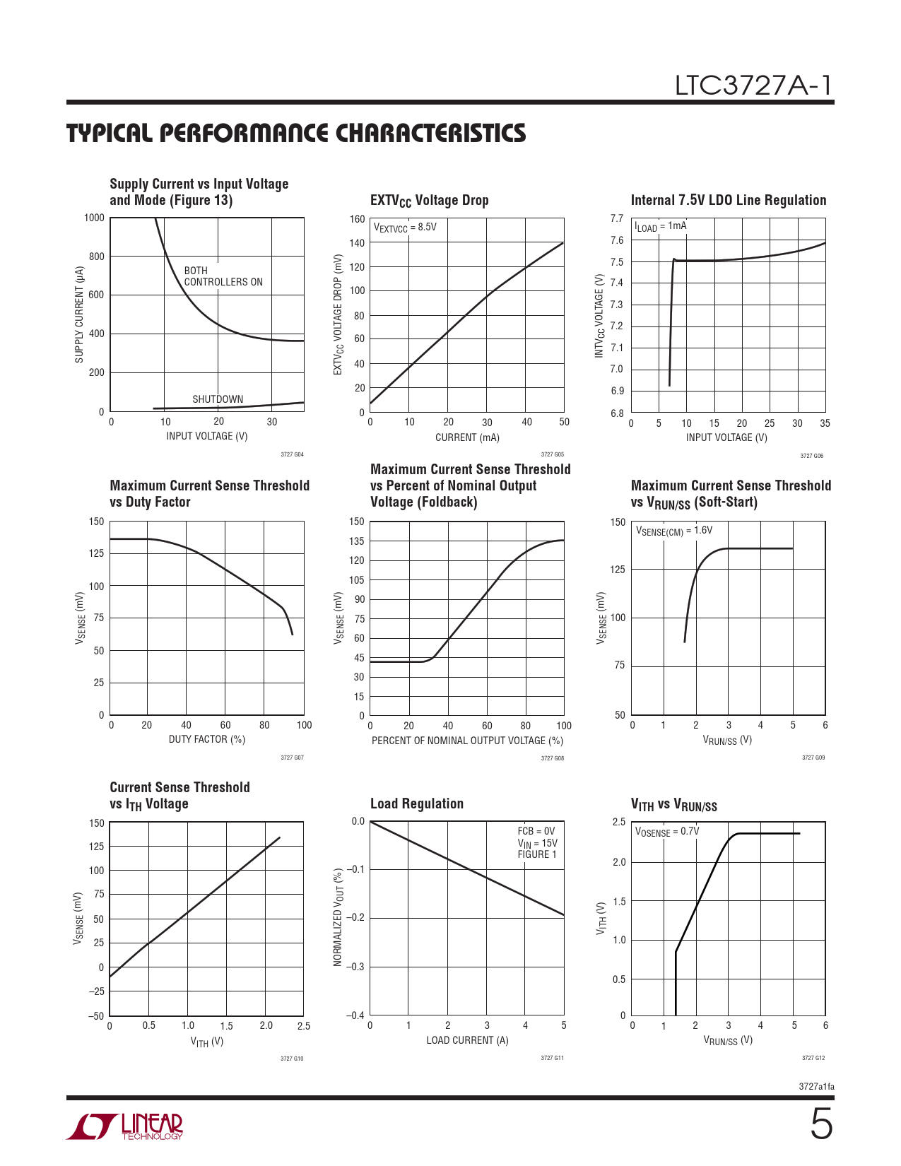 150 150 150 VSENSE(CM) = 1.6V 135 125 120 125 105 100 90 (mV) (mV) (mV) 75 75 100 SENSE SENSE SENSE V V 60 V 50 45 75 30 25 15 0 0 50 0 20 40 60 80 100 0 20 40 60 80 100 0 1 2 3 4 5 6 DUTY FACTOR (%) PERCENT OF NOMINAL OUTPUT VOLTAGE (%) VRUN/SS (V) 3727 G07 3727 G08 3727 G09
