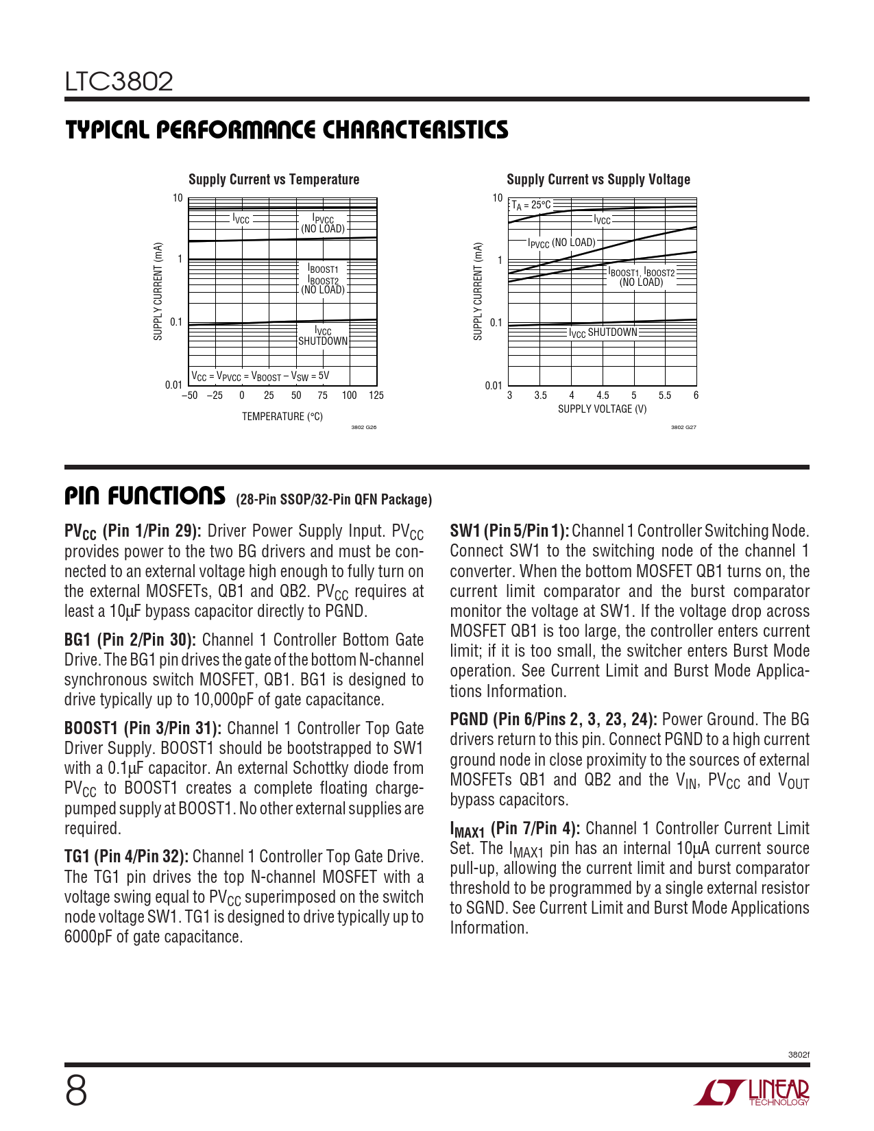 10 10 TA = 25°C IVCC IPVCC IVCC (NO LOAD) IPVCC (NO LOAD) 1 1 IBOOST1 IBOOST1, IBOOST2 IBOOST2 (NO LOAD) (NO LOAD) 0.1 0.1 IVCC I SUPPLY CURRENT (mA) VCC SHUTDOWN SHUTDOWN SUPPLY CURRENT (mA) VCC = VPVCC = VBOOST – VSW = 5V 0.01 0.01 –50 –25 0 25 50 75 100 125 3 3.5 4 4.5 5 5.5 6 SUPPLY VOLTAGE (V) TEMPERATURE (°C) 3802 G26 3802 G27