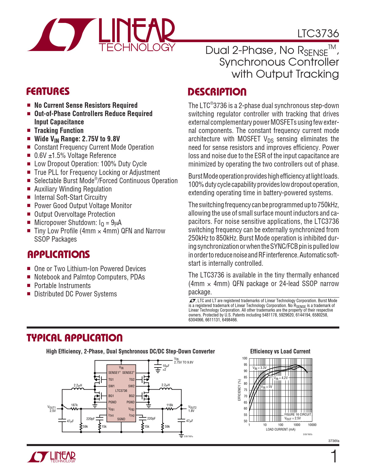 in order to reduce noise and RF interference. Automatic soft- start is internally controlled. ■ One or Two Lithium-Ion Powered Devices ■ The LTC3736 is available in the tiny thermally enhanced Notebook and Palmtop Computers, PDAs ■ (4mm Portable Instruments × 4mm) QFN package or 24-lead SSOP narrow ■ package. Distributed DC Power Systems , LTC and LT are registered trademarks of Linear Technology Corporation. Burst Mode is a registered trademark of Linear Technology Corporation. No RSENSE is a trademark of Linear Technology Corporation. All other trademarks are the property of their respective owners. Protected by U.S. Patents including 5481178, 5929620, 6144194, 6580258, 6304066, 6611131, 6498466.