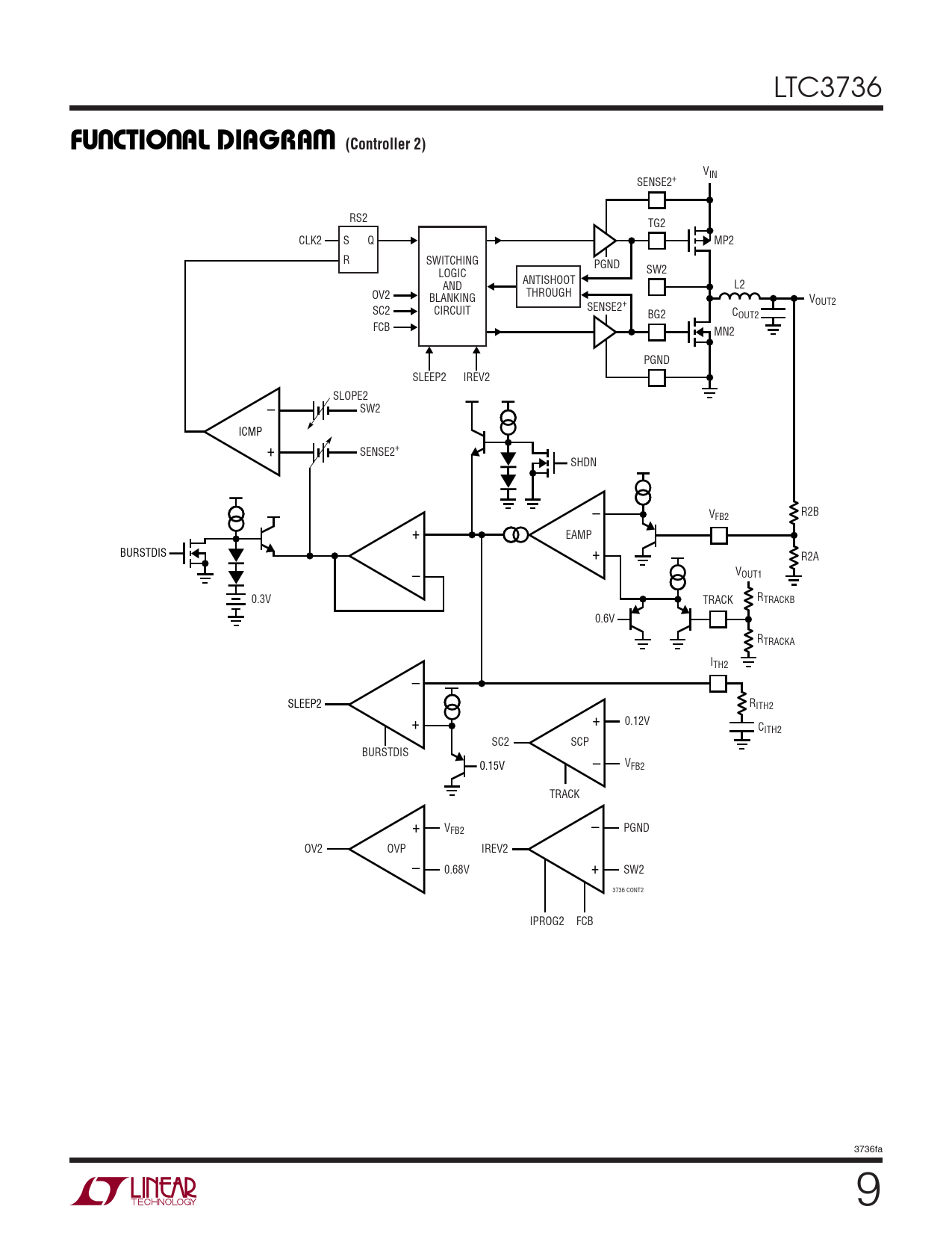 VIN SENSE2+ RS2 TG2 CLK2 S Q MP2 R SWITCHING PGND SW2 LOGIC ANTISHOOT AND L2 OV2 THROUGH BLANKING VOUT2 SC2 SENSE2+ CIRCUIT C BG2 OUT2 FCB MN2 PGND SLEEP2 IREV2 SLOPE2 – SW2 ICMP + SENSE2+ SHDN – R2B VFB2 + EAMP + BURSTDIS R2A VOUT1 – R 0.3V TRACK TRACKB 0.6V RTRACKA ITH2 – SLEEP2 RITH2 + + 0.12V CITH2 SC2 SCP BURSTDIS V 0.15V – FB2 TRACK + VFB2 – PGND OV2 OVP IREV2 – 0.68V + SW2 3736 CONT2 IPROG2 FCB 3736fa 9