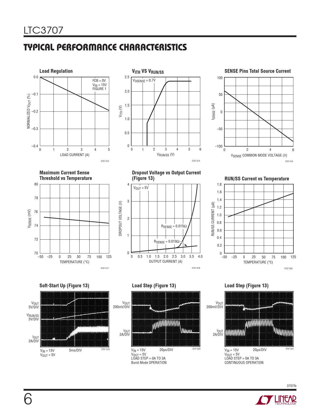0.0 2.5 100 FCB = 0V VOSENSE = 0.7V VIN = 15V FIGURE 1 2.0 –0.1 50 (%) OUT 1.5 (V) (μA) –0.2 0 ITHV 1.0 I SENSE NORMALIZED V –0.3 –50 0.5 –0.4 0 –100 0 1 2 3 4 5 0 1 2 3 4 5 6 0 2 4 6 LOAD CURRENT (A) VRUN/SS (V) VSENSE COMMON MODE VOLTAGE (V) 3707 G13 3707 G14 3707 G15