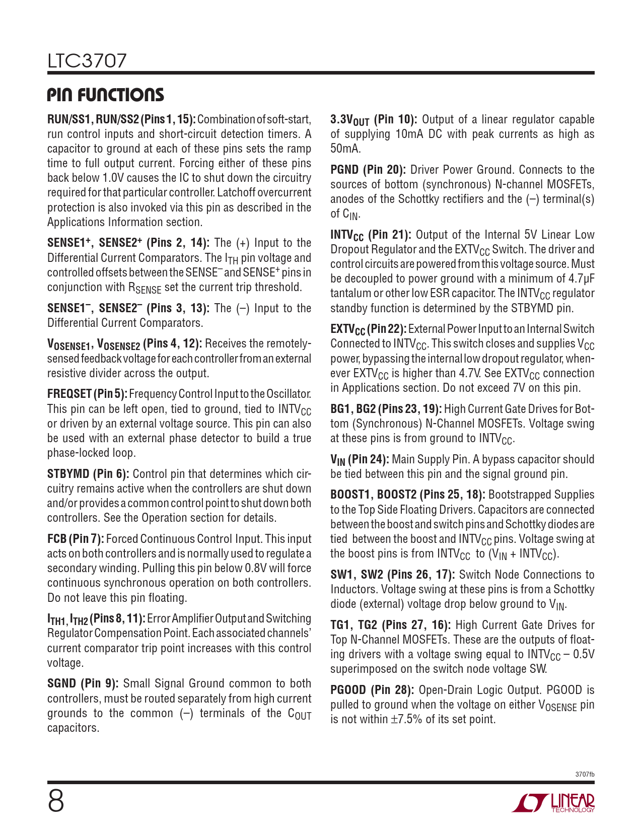 LTC3707 PIN FUNCTIONSRUN/SS1, RUN/SS2 (Pins 1, 15): Combination of soft-start, 3.3VOUT (Pin 10): Output of a linear regulator capable run control inputs and short-circuit detection timers. A of supplying 10mA DC with peak currents as high as capacitor to ground at each of these pins sets the ramp 50mA. time to full output current. Forcing either of these pins PGND (Pin 20): Driver Power Ground. Connects to the back below 1.0V causes the IC to shut down the circuitry sources of bottom (synchronous) N-channel MOSFETs, required for that particular controller. Latchoff overcurrent anodes of the Schottky rectifi ers and the (–) terminal(s) protection is also invoked via this pin as described in the of C Applications Information section. IN. INTVSENSE1+, SENSE2+ (Pins 2, 14): The (+) Input to the CC (Pin 21): Output of the Internal 5V Linear Low Dropout Regulator and the EXTV Differential Current Comparators. The I CC Switch. The driver and TH pin voltage and control circuits are powered from this voltage source. Must controlled offsets between the SENSE– and SENSE+ pins in be decoupled to power ground with a minimum of 4.7μF conjunction with RSENSE set the current trip threshold. tantalum or other low ESR capacitor. The INTVCC regulator SENSE1–, SENSE2– (Pins 3, 13): The (–) Input to the standby function is determined by the STBYMD pin. Differential Current Comparators. EXTVCC (Pin 22): External Power Input to an Internal Switch VOSENSE1, VOSENSE2 (Pins 4, 12): Receives the remotely- Connected to INTVCC. This switch closes and supplies VCC sensed feedback voltage for each controller from an external power, bypassing the internal low dropout regulator, when- resistive divider across the output. ever EXTVCC is higher than 4.7V. See EXTVCC connection in Applications section. Do not exceed 7V on this pin. FREQSET (Pin 5): Frequency Control Input to the Oscillator. This pin can be left open, tied to ground, tied to INTVCC BG1, BG2 (Pins 23, 19): High Current Gate Drives for Bot- or driven by an external voltage source. This pin can also tom (Synchronous) N-Channel MOSFETs. Voltage swing be used with an external phase detector to build a true at these pins is from ground to INTVCC. phase-locked loop. VIN (Pin 24): Main Supply Pin. A bypass capacitor should STBYMD (Pin 6): Control pin that determines which cir- be tied between this pin and the signal ground pin. cuitry remains active when the controllers are shut down BOOST1, BOOST2 (Pins 25, 18): Bootstrapped Supplies and/or provides a common control point to shut down both to the Top Side Floating Drivers. Capacitors are connected controllers. See the Operation section for details. between the boost and switch pins and Schottky diodes are FCB (Pin 7): Forced Continuous Control Input. This input tied between the boost and INTVCC pins. Voltage swing at acts on both controllers and is normally used to regulate a the boost pins is from INTVCC to (VIN + INTVCC). secondary winding. Pulling this pin below 0.8V will force SW1, SW2 (Pins 26, 17): Switch Node Connections to continuous synchronous operation on both controllers. Inductors. Voltage swing at these pins is from a Schottky Do not leave this pin fl oating. diode (external) voltage drop below ground to VIN. ITH1, ITH2 (Pins 8, 11): Error Amplifi er Output and Switching TG1, TG2 (Pins 27, 16): High Current Gate Drives for Regulator Compensation Point. Each associated channels’ Top N-Channel MOSFETs. These are the outputs of fl oat- current comparator trip point increases with this control ing drivers with a voltage swing equal to INTV voltage. CC – 0.5V superimposed on the switch node voltage SW. SGND (Pin 9): Small Signal Ground common to both PGOOD (Pin 28): Open-Drain Logic Output. PGOOD is controllers, must be routed separately from high current pulled to ground when the voltage on either V grounds to the common (–) terminals of the C OSENSE pin OUT is not within ±7.5% of its set point. capacitors. 3707fb 8