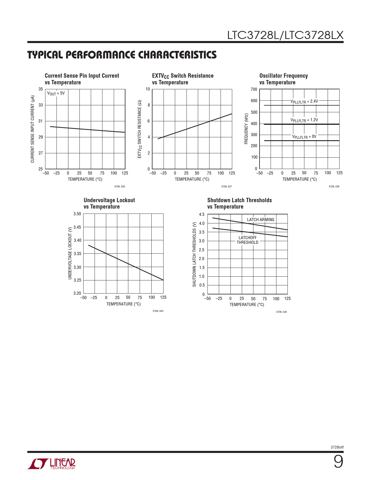 35 10 700 VOUT = 5V 600 VPLLFLTR = 2.4V 33 8 500 31 6 VPLLFLTR = 1.2V 400 29 4 300 VPLLFLTR = 0V SWITCH RESISTANCE (Ω) FREQUENCY (kHz) CC 200 27 2 EXTV 100 CURRENT SENSE INPUT CURRENT (µA) 25 0 0 –50 –25 0 25 50 75 100 125 –50 –25 0 25 50 75 100 125 –50 –25 0 25 50 75 100 125 TEMPERATURE (°C) TEMPERATURE (°C) TEMPERATURE (°C) 3728L G26 3728L G27 3728L G28