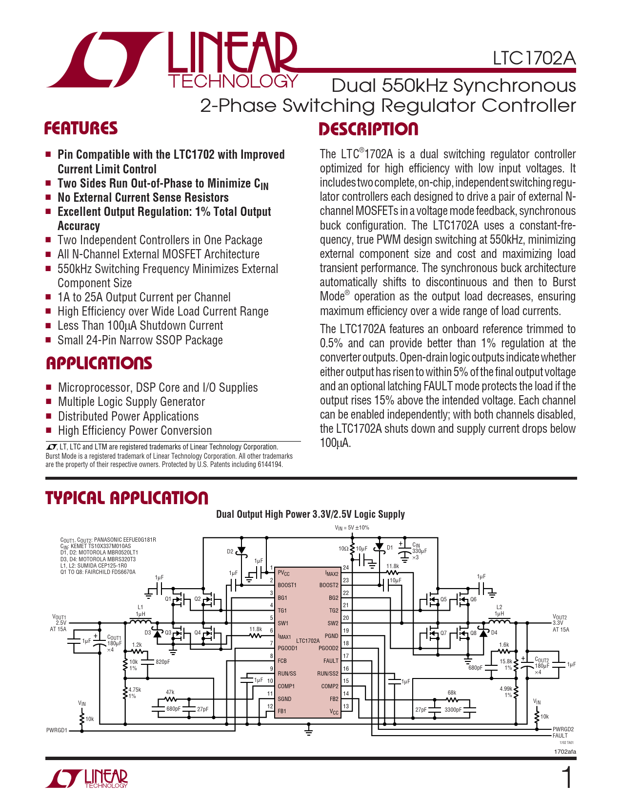 LTC1702A Dual 550kHz Synchronous 2-Phase Switching Regulator Controller UFEATURESDESCRIPTIO ■ Pin Compatible with the LTC1702 with Improved The LTC®1702A is a dual switching regulator controller Current Limit Control optimized for high efficiency with low input voltages. It ■ Two Sides Run Out-of-Phase to Minimize C includes two complete, on-chip, independent switching regu- IN ■ No External Current Sense Resistors lator controllers each designed to drive a pair of external N- ■ Excellent Output Regulation: 1% Total Output channel MOSFETs in a voltage mode feedback, synchronous Accuracy buck configuration. The LTC1702A uses a constant-fre- ■ Two Independent Controllers in One Package quency, true PWM design switching at 550kHz, minimizing ■ All N-Channel External MOSFET Architecture external component size and cost and maximizing load ■ 550kHz Switching Frequency Minimizes External transient performance. The synchronous buck architecture Component Size automatically shifts to discontinuous and then to Burst ■ 1A to 25A Output Current per Channel Mode® operation as the output load decreases, ensuring ■ High Efficiency over Wide Load Current Range maximum efficiency over a wide range of load currents. ■ Less Than 100µA Shutdown Current The LTC1702A features an onboard reference trimmed to ■ Small 24-Pin Narrow SSOP Package 0.5% and can provide better than 1% regulation at the U converter outputs. Open-drain logic outputs indicate whether APPLICATIO S either output has risen to within 5% of the final output voltage ■ Microprocessor, DSP Core and I/O Supplies and an optional latching FAULT mode protects the load if the ■ Multiple Logic Supply Generator output rises 15% above the intended voltage. Each channel ■ Distributed Power Applications can be enabled independently; with both channels disabled, ■ High Efficiency Power Conversion the LTC1702A shuts down and supply current drops below 100 , LT, LTC and LTM are registered trademarks of Linear Technology Corporation. µA. Burst Mode is a registered trademark of Linear Technology Corporation. All other trademarks are the property of their respective owners. Protected by U.S. Patents including 6144194. UTYPICAL APPLICATIODual Output High Power 3.3V/2.5V Logic Supply VIN = 5V ±10% COUT1, COUT2: PANASONIC EEFUE0G181R + C C IN: KEMET TS10X337M010AS 10Ω 10 D1 µF IN D2 D1, D2: MOTOROLA MBR0520LT1 330µF D3, D4: MOTOROLA MBRS320T3 ×3 1µF L1, L2: SUMIDA CEP125-1R0 1 24 11.8k Q1 TO Q8: FAIRCHILD FDS6670A 1µF PVCC IMAX2 1µF 1µF 2 23 10µF BOOST1 BOOST2 3 22 Q1 Q2 BG1 BG2 Q5 Q6 4 21 L1 L2 TG1 TG2 V 1µH 1µH OUT1 5 20 VOUT2 2.5V SW1 SW2 3.3V AT 15A 11.8k 6 19 AT 15A D3 Q3 Q4 + D4 I Q7 Q8 C MAX1 PGND OUT1 1µF LTC1702A 180µF 7 18 1.2k 1.6k PGOOD1 PGOOD2 ×4 8 17 + 10k C 820pF FCB FAULT 15.8k OUT2 1µF 1% 180µF 9 16 680pF 1% RUN/SS RUN/SS2 ×4 1µF 10 15 1µF COMP1 COMP2 4.75k 4.99k 47k 11 14 68k 1% 1% SGND FB2 V V IN IN 12 13 680pF 27pF FB1 V 27pF 3300pF CC 10k 10k PWRGD1 PWRGD2 FAULT 1702 TA01 1702afa 1