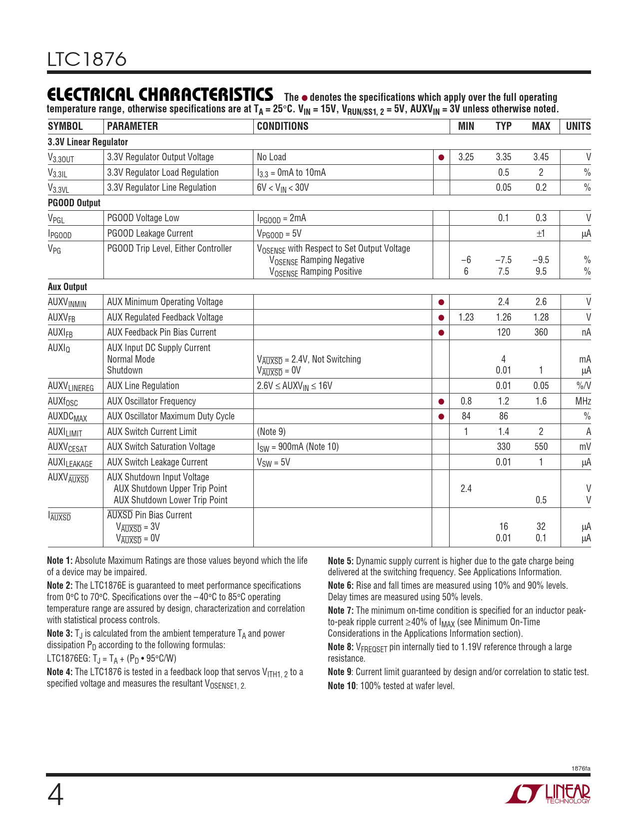 LTC1876 ELECTRICAL CHARACTERISTICS The ● denotes the specifications which apply over the full operating temperature range, otherwise specifications are at TA = 25 ° C. VIN = 15V, VRUN/SS1, 2 = 5V, AUXVIN = 3V unless otherwise noted.SYMBOLPARAMETERCONDITIONSMINTYPMAXUNITS3.3V Linear Regulator V3.3OUT 3.3V Regulator Output Voltage No Load ● 3.25 3.35 3.45 V V3.3IL 3.3V Regulator Load Regulation I3.3 = 0mA to 10mA 0.5 2 % V3.3VL 3.3V Regulator Line Regulation 6V < VIN < 30V 0.05 0.2 % PGOOD Output VPGL PGOOD Voltage Low IPGOOD = 2mA 0.1 0.3 V IPGOOD PGOOD Leakage Current VPGOOD = 5V ±1 µA VPG PGOOD Trip Level, Either Controller VOSENSE with Respect to Set Output Voltage VOSENSE Ramping Negative –6 –7.5 –9.5 % VOSENSE Ramping Positive 6 7.5 9.5 % Aux Output AUXVINMIN AUX Minimum Operating Voltage ● 2.4 2.6 V AUXVFB AUX Regulated Feedback Voltage ● 1.23 1.26 1.28 V AUXIFB AUX Feedback Pin Bias Current ● 120 360 nA AUXIQ AUX Input DC Supply Current Normal Mode VAUXSD = 2.4V, Not Switching 4 mA Shutdown VAUXSD = 0V 0.01 1 µA AUXVLINEREG AUX Line Regulation 2.6V ≤ AUXVIN ≤ 16V 0.01 0.05 %/V AUXfOSC AUX Oscillator Frequency ● 0.8 1.2 1.6 MHz AUXDCMAX AUX Oscillator Maximum Duty Cycle ● 84 86 % AUXILIMIT AUX Switch Current Limit (Note 9) 1 1.4 2 A AUXVCESAT AUX Switch Saturation Voltage ISW = 900mA (Note 10) 330 550 mV AUXILEAKAGE AUX Switch Leakage Current VSW = 5V 0.01 1 µA AUXVAUXSD AUX Shutdown Input Voltage AUX Shutdown Upper Trip Point 2.4 V AUX Shutdown Lower Trip Point 0.5 V IAUXSD AUXSD Pin Bias Current VAUXSD = 3V 16 32 µA VAUXSD = 0V 0.01 0.1 µA Note 1: Absolute Maximum Ratings are those values beyond which the life Note 5: Dynamic supply current is higher due to the gate charge being of a device may be impaired. delivered at the switching frequency. See Applications Information. Note 2: The LTC1876E is guaranteed to meet performance specifications Note 6: Rise and fall times are measured using 10% and 90% levels. from 0°C to 70°C. Specifications over the – 40°C to 85°C operating Delay times are measured using 50% levels. temperature range are assured by design, characterization and correlation Note 7: The minimum on-time condition is specified for an inductor peak- with statistical process controls. to-peak ripple current ≥40% of IMAX (see Minimum On-Time Note 3: TJ is calculated from the ambient temperature TA and power Considerations in the Applications Information section). dissipation PD according to the following formulas: Note 8: VFREQSET pin internally tied to 1.19V reference through a large LTC1876EG: TJ = TA + (PD • 95°C/W) resistance. Note 4: The LTC1876 is tested in a feedback loop that servos VITH1, 2 to a Note 9 : Current limit guaranteed by design and/or correlation to static test. specified voltage and measures the resultant VOSENSE1, 2. Note 10 : 100% tested at wafer level. 1876fa 4