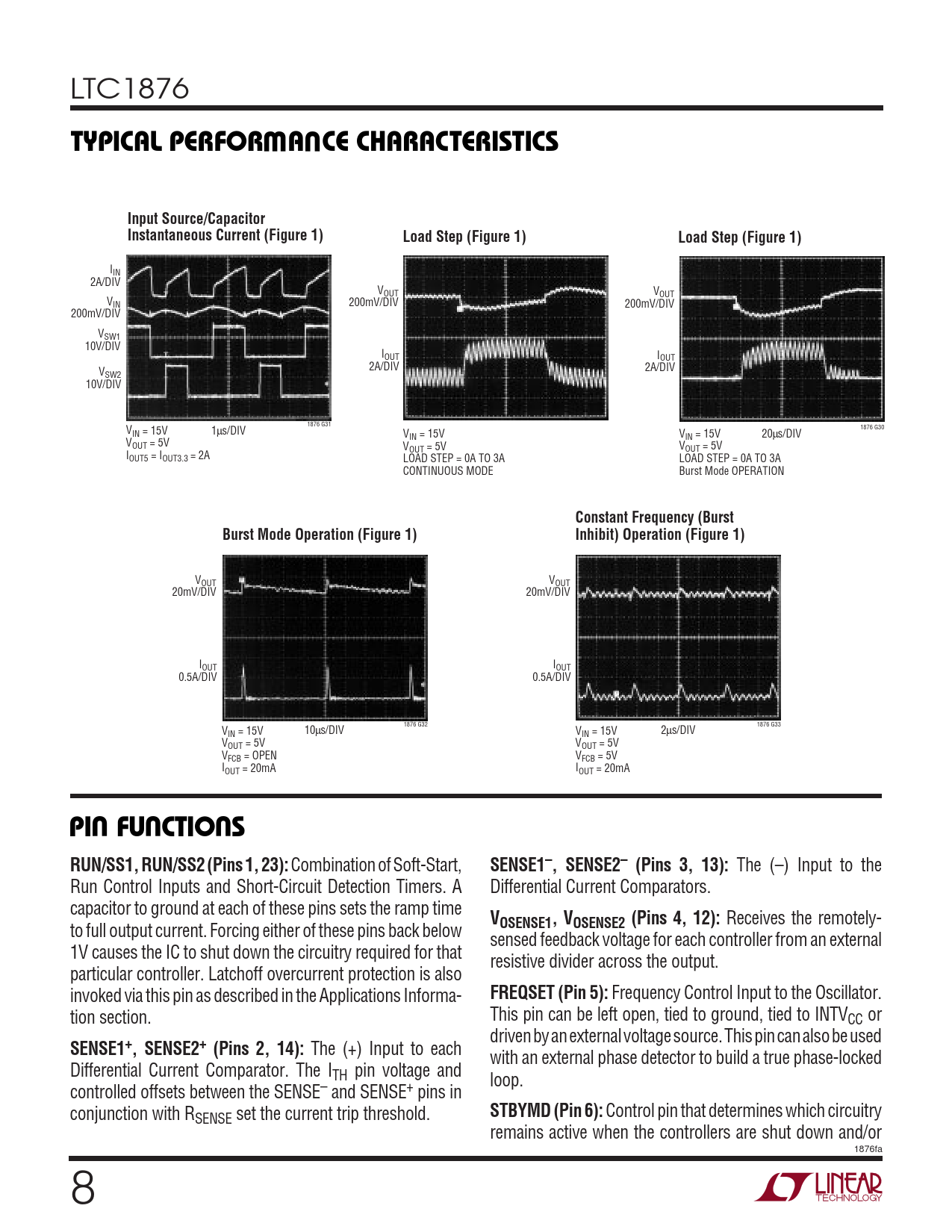 LTC1876 WUTYPICAL PERFOR A CE CHARACTERISTICSInput Source/Capacitor Instantaneous Current (Figure 1)Load Step (Figure 1)Load Step (Figure 1) IIN 2A/DIV VOUT VOUT VIN 200mV/DIV 200mV/DIV 200mV/DIV VSW1 10V/DIV IOUT IOUT 2A/DIV 2A/DIV VSW2 10V/DIV 1876 G31 1876 G30 VIN = 15V 1µs/DIV V V IN = 15V IN = 15V 20µs/DIV VOUT = 5V V V OUT = 5V OUT = 5V IOUT5 = IOUT3.3 = 2A LOAD STEP = 0A TO 3A LOAD STEP = 0A TO 3A CONTINUOUS MODE Burst Mode OPERATION Constant Frequency (BurstBurst Mode Operation (Figure 1)Inhibit) Operation (Figure 1) VOUT VOUT 20mV/DIV 20mV/DIV IOUT IOUT 0.5A/DIV 0.5A/DIV 1876 G32 1876 G33 VIN = 15V 10µs/DIV VIN = 15V 2µs/DIV VOUT = 5V VOUT = 5V VFCB = OPEN VFCB = 5V IOUT = 20mA IOUT = 20mA UUUPIN FUNCTIONSRUN/SS1, RUN/SS2 (Pins 1, 23): Combination of Soft-Start, SENSE1–, SENSE2– (Pins 3, 13): The (–) Input to the Run Control Inputs and Short-Circuit Detection Timers. A Differential Current Comparators. capacitor to ground at each of these pins sets the ramp time V to full output current. Forcing either of these pins back below OSENSE1, VOSENSE2 (Pins 4, 12): Receives the remotely- sensed feedback voltage for each controller from an external 1V causes the IC to shut down the circuitry required for that resistive divider across the output. particular controller. Latchoff overcurrent protection is also invoked via this pin as described in the Applications Informa- FREQSET (Pin 5): Frequency Control Input to the Oscillator. tion section. This pin can be left open, tied to ground, tied to INTVCC or driven by an external voltage source. This pin can also be used SENSE1+, SENSE2+ (Pins 2, 14): The (+) Input to each with an external phase detector to build a true phase-locked Differential Current Comparator. The ITH pin voltage and loop. controlled offsets between the SENSE– and SENSE+ pins in conjunction with R STBYMD (Pin 6): Control pin that determines which circuitry SENSE set the current trip threshold. remains active when the controllers are shut down and/or 1876fa 8