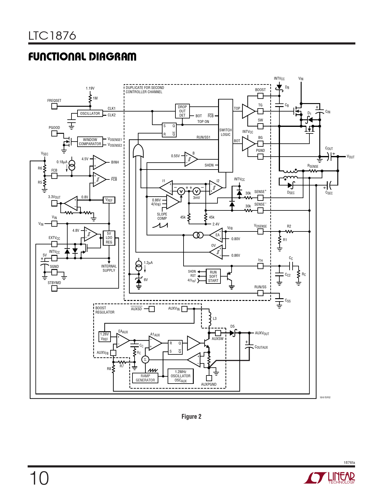 INTVCC VIN DUPLICATE FOR SECOND D 1.19V B BOOST CONTROLLER CHANNEL 1M FREQSET TG CB CLK1 DROP TOP + OUT CIN OSCILLATOR D CLK2 1 DET BOT FCB SW TOP ON S Q PGOOD SWITCH INTVCC R Q LOGIC V RUN/SS1 BG WINDOW OSENSE1 BOT COMPARATOR VOSENSE2 C PGND OUT+ VSEC B 0.55V + V 4.5V – OUT 0.18µA BINH – + SHDN RSENSE R6 FCB + FCB INTVCC R5 – I1 I2 + – – + + – + – + SENSE+ D 30k SEC CSEC 3.3VOUT 0.8V 3mV + VREF 0.86V 4(V SENSE– – FB) 30k SLOPE VIN COMP 45k 45k VIN 2.4V VOSENSE R2 VFB 4.8V + – 5V EA EXTV – CC LDO + 0.80V R1 REG OV + INTVCC 5V – 0.86V + C I C TH 1.2µA SGND INTERNAL SUPPLY SHDN RUN C R RST SOFT C2 C 6V 4(VFB) START STBYMD RUN/SS CSS BOOST AUXSD AUXVIN REGULATOR L3 D5 EAAUX 1.26V A1 AUXVOUT + AUX VREF – AUXSW + – R Q CC + COUTAUX S Q AUXV R FB C + Σ – R7 R8 1.2MHz RAMP OSCILLATOR GENERATOR OSCAUX AUXPGND 1876 FD/F02