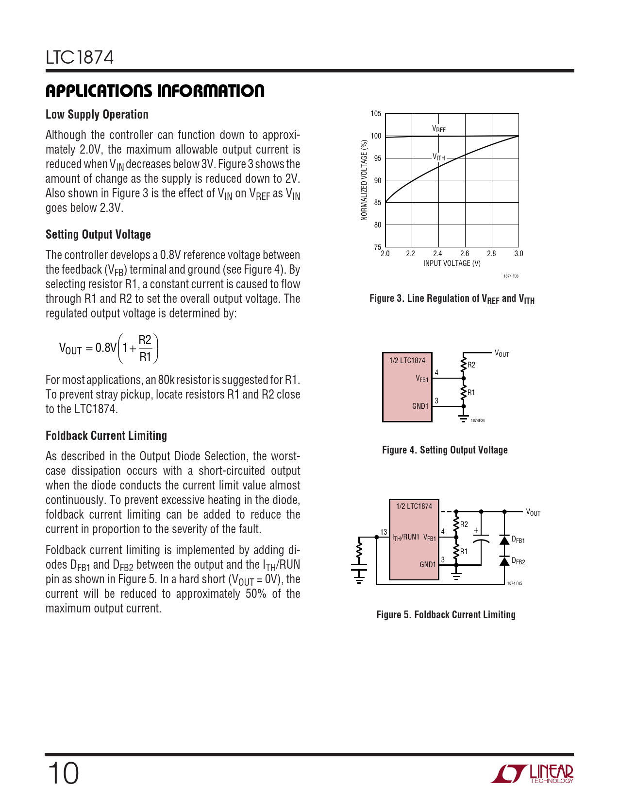 LTC1874 UUWUAPPLICATIO S I FOR ATIO 105 Low Supply Operation VREF Although the controller can function down to approxi- 100 mately 2.0V, the maximum allowable output current is 95 VITH reduced when VIN decreases below 3V. Figure 3 shows the amount of change as the supply is reduced down to 2V. 90 Also shown in Figure 3 is the effect of VIN on VREF as VIN 85 goes below 2.3V. NORMALIZED VOLTAGE (%) 80 Setting Output Voltage 752.0 2.2 2.4 2.6 2.8 3.0 The controller develops a 0.8V reference voltage between INPUT VOLTAGE (V) the feedback (VFB) terminal and ground (see Figure 4). By 1874 F03 selecting resistor R1, a constant current is caused to flow through R1 and R2 to set the overall output voltage. The Figure 3. Line Regulation of VREF and VITH regulated output voltage is determined by: R2 V 0. V OUT = 8 1 + R1 VOUT 1/2 LTC1874 R2 4 For most applications, an 80k resistor is suggested for R1. VFB1 To prevent stray pickup, locate resistors R1 and R2 close R1 3 to the LTC1874. GND1 1874F04 Foldback Current LimitingFigure 4. Setting Output Voltage As described in the Output Diode Selection, the worst- case dissipation occurs with a short-circuited output when the diode conducts the current limit value almost continuously. To prevent excessive heating in the diode, 1/2 LTC1874 foldback current limiting can be added to reduce the VOUT current in proportion to the severity of the fault. R2 13 4 + I V TH/RUN1 FB1 DFB1 Foldback current limiting is implemented by adding di- R1 odes D 3 DFB2 FB1 and DFB2 between the output and the ITH/RUN GND1 pin as shown in Figure 5. In a hard short (VOUT = 0V), the 1874 F05 current will be reduced to approximately 50% of the maximum output current. Figure 5. Foldback Current Limiting 10
