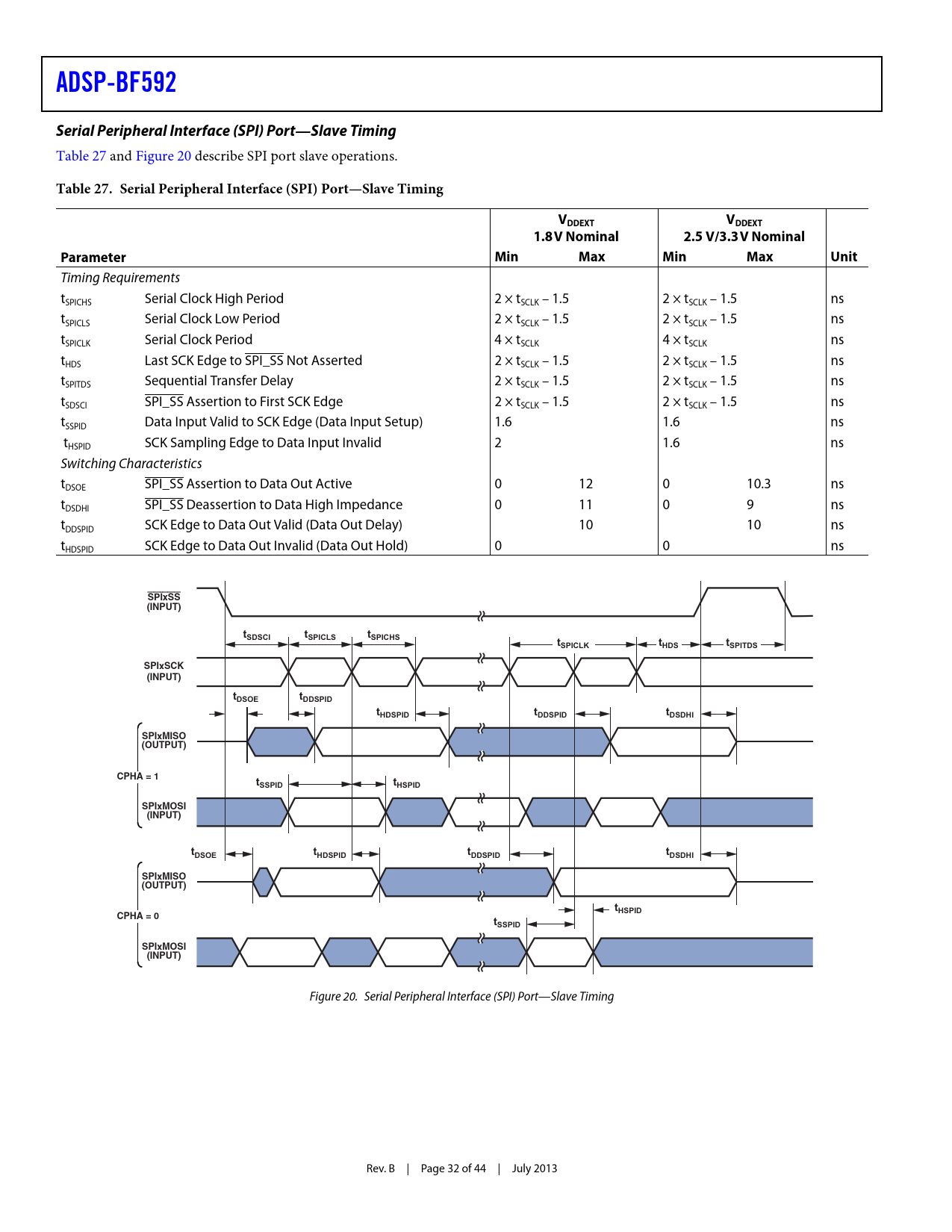 Table 27. Serial Peripheral Interface (SPI) Port—Slave Timing VDDEXT VDDEXT 1.8V Nominal 2.5 V/3.3V Nominal Parameter Min Max Min Max Unit