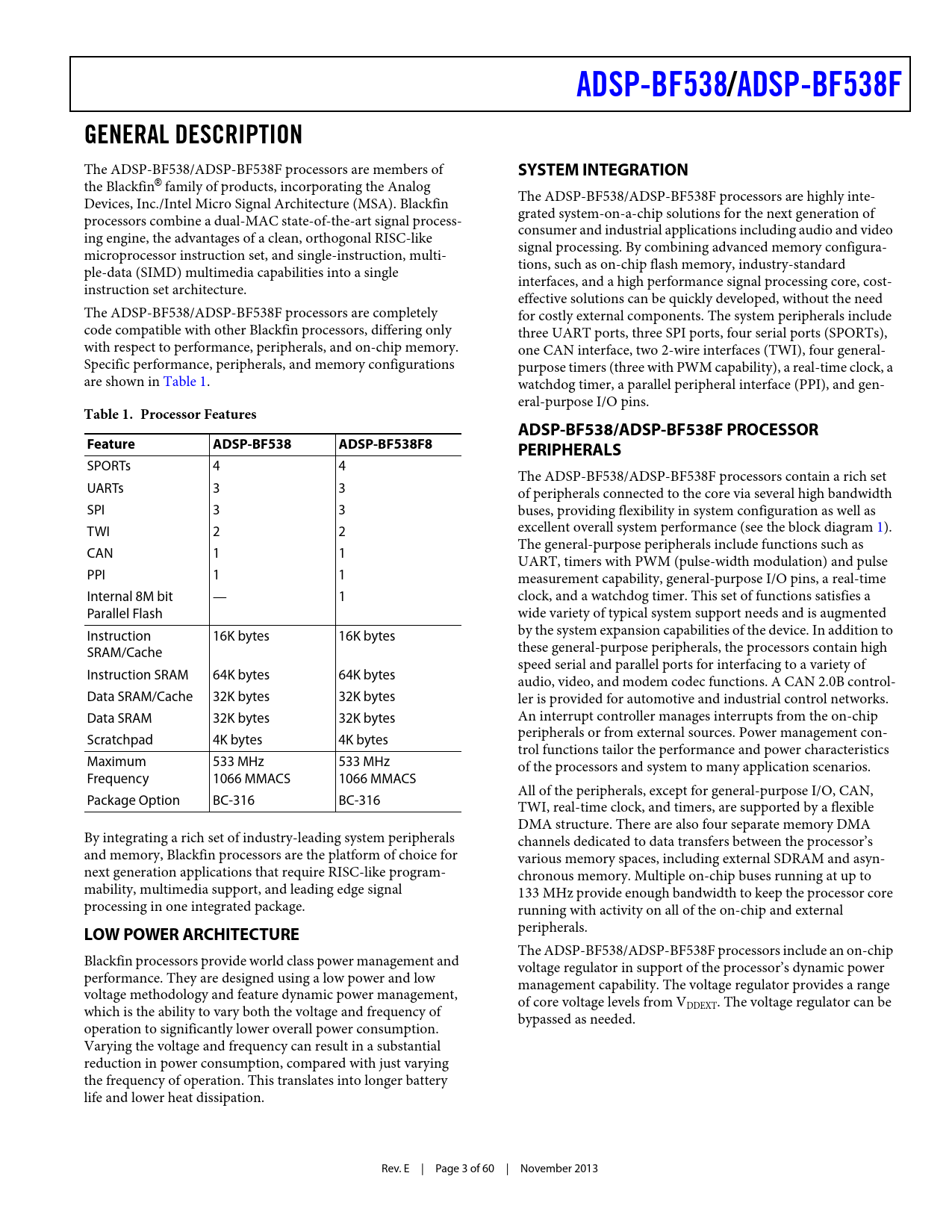 ADSP-BF538/ ADSP-BF538F GENERAL DESCRIPTION SYSTEM INTEGRATION Table 1 Processor Features ADSP-BF538/ADSP-BF538F PROCESSOR
