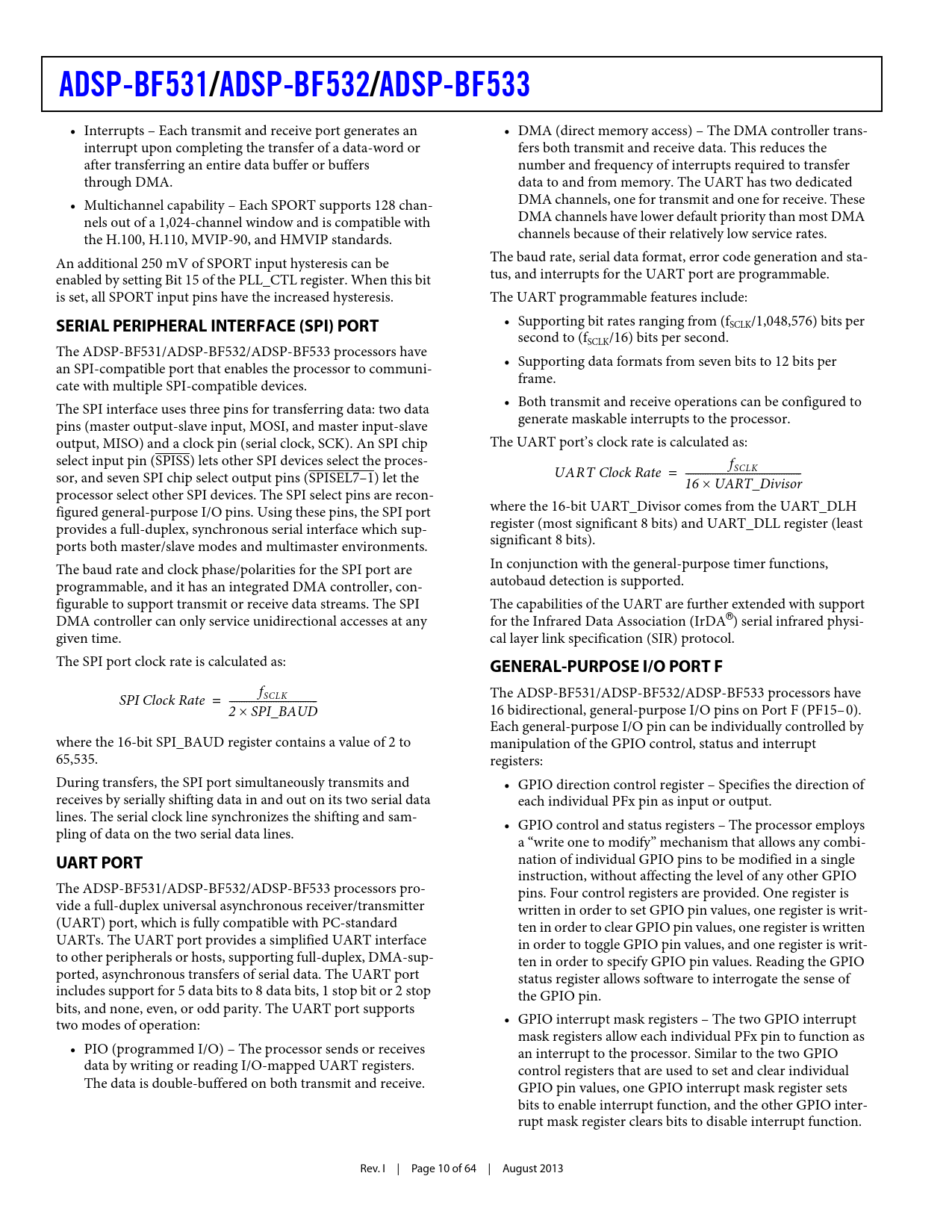 ADSP-BF531/ADSP-BF532/ADSP-BF533 • Interrupts – Each transmit and receive port generates an • DMA (direct memory access) – The DMA controller trans- interrupt upon completing the transfer of a data-word or fers both transmit and receive data. This reduces the after transferring an entire data buffer or buffers number and frequency of interrupts required to transfer through DMA. data to and from memory. The UART has two dedicated • Multichannel capability – Each SPORT supports 128 chan- DMA channels, one for transmit and one for receive. These nels out of a 1,024-channel window and is compatible with DMA channels have lower default priority than most DMA the H.100, H.110, MVIP-90, and HMVIP standards. channels because of their relatively low service rates. An additional 250 mV of SPORT input hysteresis can be The baud rate, serial data format, error code generation and sta- enabled by setting Bit 15 of the PLL_CTL register. When this bit tus, and interrupts for the UART port are programmable. is set, all SPORT input pins have the increased hysteresis. The UART programmable features include: SERIAL PERIPHERAL INTERFACE (SPI) PORT • Supporting bit rates ranging from (fSCLK/1,048,576) bits per second to (fSCLK/16) bits per second. The ADSP-BF531/ADSP-BF532/ADSP-BF533 processors have • Supporting data formats from seven bits to 12 bits per an SPI-compatible port that enables the processor to communi- frame. cate with multiple SPI-compatible devices. • Both transmit and receive operations can be configured to The SPI interface uses three pins for transferring data: two data generate maskable interrupts to the processor. pins (master output-slave input, MOSI, and master input-slave output, MISO) and a clock pin (serial clock, SCK). An SPI chip The UART port’s clock rate is calculated as: select input pin (SPISS) lets other SPI devices select the proces- fSCLK sor, and seven SPI chip select output pins (SPISEL7–1) let the UART Clock Rate = ------------------------ 16 UART_Divisor processor select other SPI devices. The SPI select pins are recon- figured general-purpose I/O pins. Using these pins, the SPI port where the 16-bit UART_Divisor comes from the UART_DLH provides a full-duplex, synchronous serial interface which sup- register (most significant 8 bits) and UART_DLL register (least ports both master/slave modes and multimaster environments. significant 8 bits). The baud rate and clock phase/polarities for the SPI port are In conjunction with the general-purpose timer functions, programmable, and it has an integrated DMA controller, con- autobaud detection is supported. figurable to support transmit or receive data streams. The SPI The capabilities of the UART are further extended with support DMA controller can only service unidirectional accesses at any for the Infrared Data Association (IrDA®) serial infrared physi- given time. cal layer link specification (SIR) protocol. The SPI port clock rate is calculated as: GENERAL-PURPOSE I/O PORT F fSCLK The ADSP-BF531/ADSP-BF532/ADSP-BF533 processors have SPI Clock Rate = ------------------ 2 SPI_BAUD 16 bidirectional, general-purpose I/O pins on Port F (PF15–0). Each general-purpose I/O pin can be individually controlled by where the 16-bit SPI_BAUD register contains a value of 2 to manipulation of the GPIO control, status and interrupt 65,535. registers: During transfers, the SPI port simultaneously transmits and • GPIO direction control register – Specifies the direction of receives by serially shifting data in and out on its two serial data each individual PFx pin as input or output. lines. The serial clock line synchronizes the shifting and sam- • GPIO contro l and status registers – The processor employs pling of data on the two serial data lines. a “write one to modify” mechanism that allows any combi- UART PORT nation of individual GPIO pins to be modified in a single instruction, without affecting the level of any other GPIO The ADSP-BF531/ADSP-BF532/ADSP-BF533 processors pro- pins. Four control registers are provided. One register is vide a full-duplex universal asynchronous receiver/transmitter written in order to set GPIO pin values, one register is writ- (UART) port, which is fully compatible with PC-standard ten in order to clear GPIO pin values, one register is written UARTs. The UART port provides a simplified UART interface in order to toggle GPIO pin values, and one register is writ- to other peripherals or hosts, supporting full-duplex, DMA-sup- ten in order to specify GPIO pin values. Reading the GPIO ported, asynchronous transfers of serial data. The UART port status register allows software to interrogate the sense of includes support for 5 data bits to 8 data bits, 1 stop bit or 2 stop the GPIO pin. bits, and none, even, or odd parity. The UART port supports two modes of operation: • GPIO interrupt mask registers – The two GPIO interrupt mask registers allow each individual PFx pin to function as • PIO (programmed I/O) – The processor sends or receives an interrupt to the processor. Similar to the two GPIO data by writing or reading I/O-mapped UART registers. control registers that are used to set and clear individual The data is double-buffered on both transmit and receive. GPIO pin values, one GPIO interrupt mask register sets bits to enable interrupt function, and the other GPIO inter- rupt mask register clears bits to disable interrupt function. Rev. I | Page 10 of 64 | August 2013 Document Outline Blackfin Embedded Processor Features Memory Peripherals Table Of Contents Revision History General Description Portable Low Power Architecture System Integration Processor Peripherals Blackfin Processor Core Memory Architecture Internal (On-Chip) Memory External (Off-Chip) Memory I/O Memory Space Booting Event Handling Core Event Controller (CEC) System Interrupt Controller (SIC) Event Control DMA Controllers Real-Time Clock Watchdog Timer Timers Serial Ports (SPORTs) Serial Perip