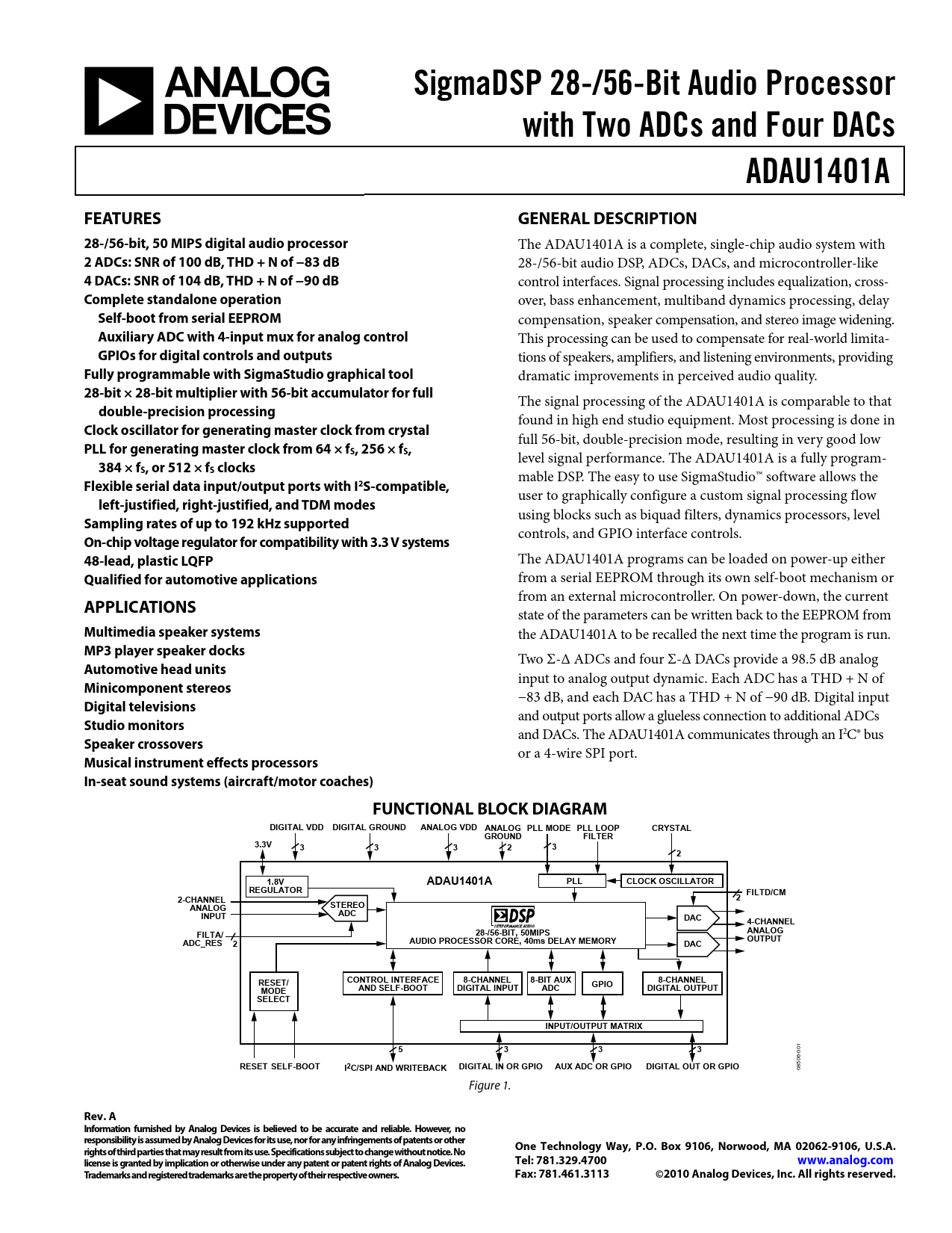 SigmaDSP 28-/56-Bit Audio Processor. with Two ADCs and Four DACs. ADAU1401A. FEATURES. GENERAL DESCRIPTION