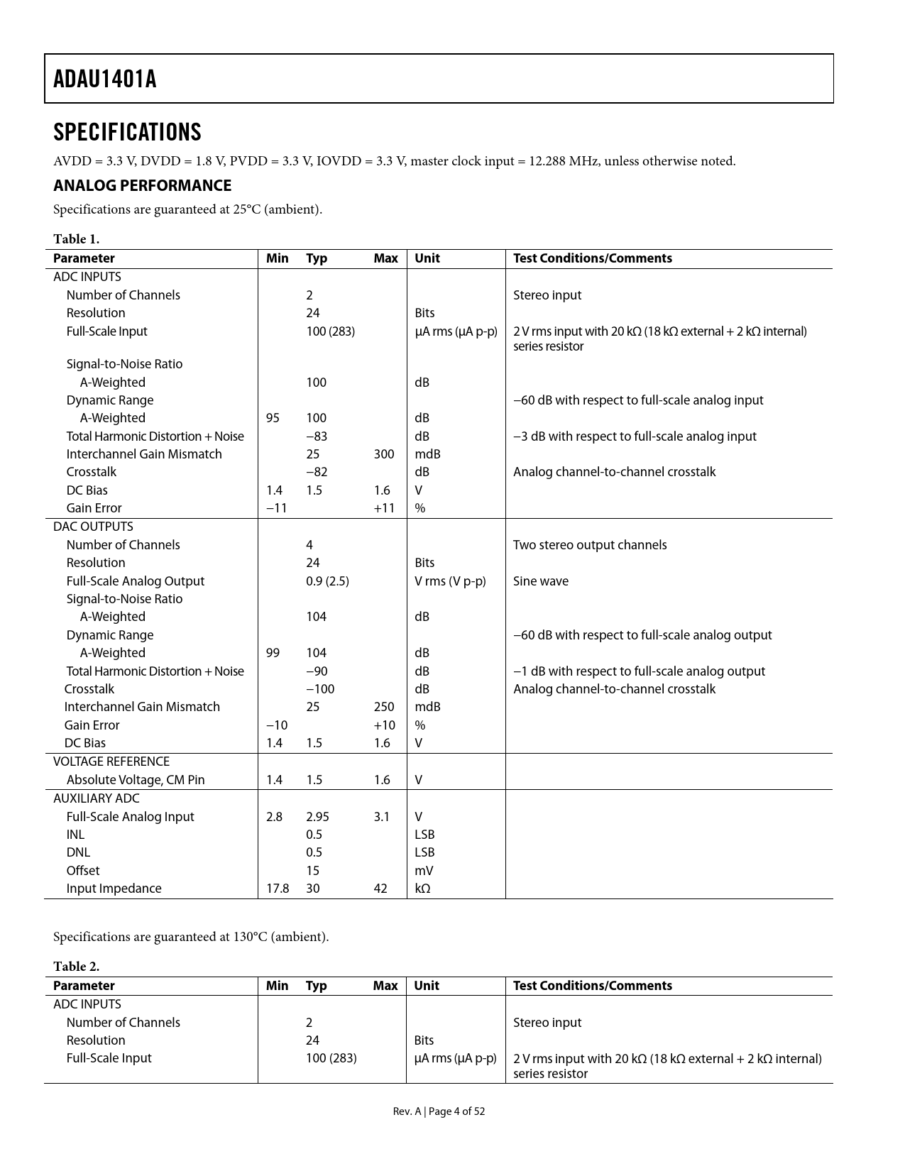 ADAU1401A SPECIFICATIONS ANALOG PERFORMANCE Table 1 Parameter Min Typ Max Unit Test Conditions/Comments Table 2 Parameter Min
