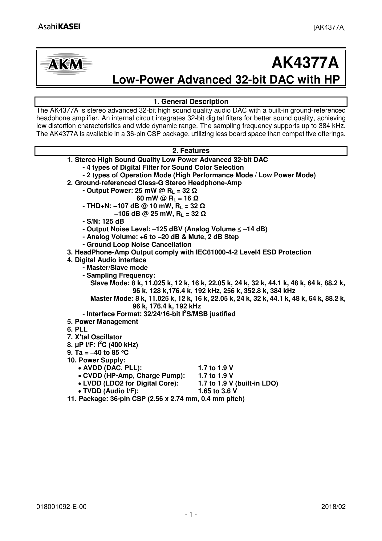 [AK4377A] AK4377A. Low-Power Advanced 32-bit DAC with HP. 1. General Description