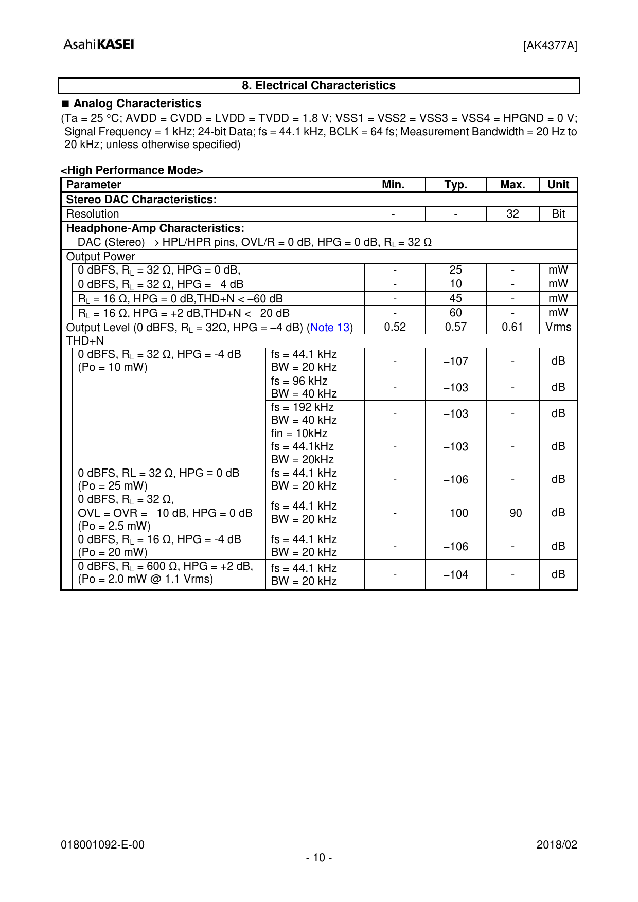 [AK4377A] 8. Electrical Characteristics ■ Analog Characteristics (Ta = 25 C; AVDD = CVDD = LVDD = TVDD = 1.8 V; VSS1 = VSS2 = VSS3 = VSS4 = HPGND = 0 V;
