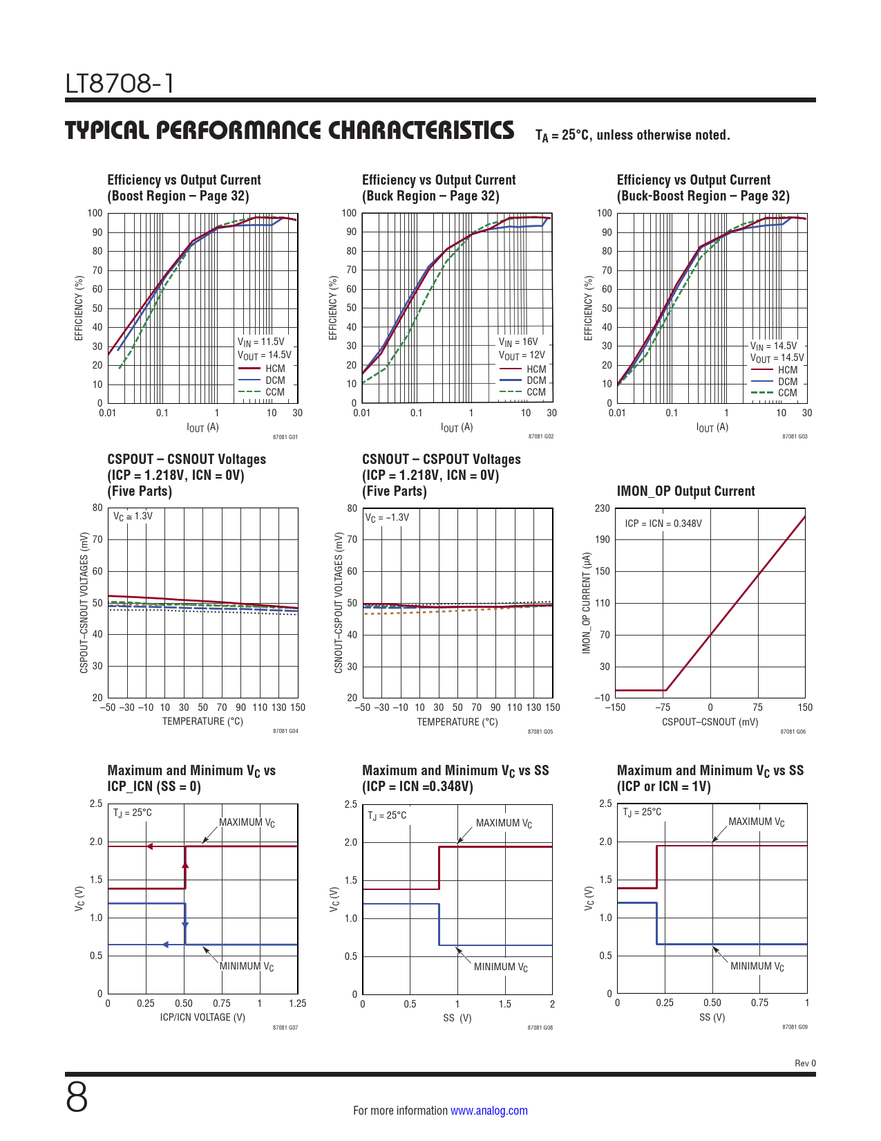 80 80 230 VC ≅ 1.3V VC = ~1.3V ICP = ICN = 0.348V 70 70 190 60 60 150 TAGES (mV) TAGES (mV) 50 50 110 40 40 70 IMON_OP CURRENT (µA) 30 CSPOUT–CSNOUT VOL 30 30 CSNOUT–CSPOUT VOL 20 20 –10 –50 –30 –10 10 30 50 70 90 110 130 150 –50 –30 –10 10 30 50 70 90 110 130 150 –150 –75 0 75 150 TEMPERATURE (°C) TEMPERATURE (°C) CSPOUT–CSNOUT (mV) 87081 G04 87081 G05 87081 G06