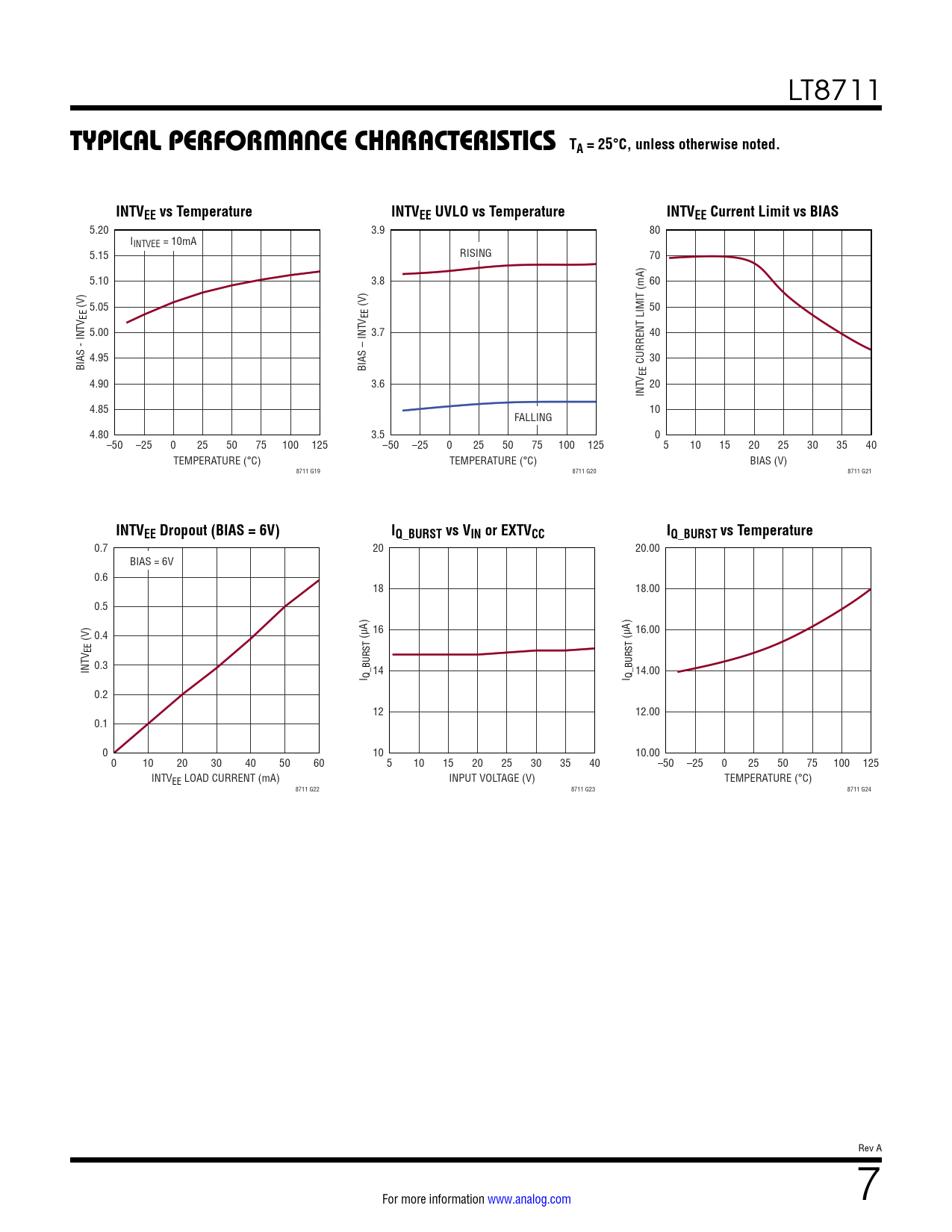 5.20 3.9 80 IINTVEE = 10mA 5.15 RISING 70 5.10 3.8 60 (V) 5.05 (V) 50 V EE V EE 5.00 3.7 40 4.95 30 BIAS - INT BIAS – INT CURRENT LIMIT (mA) 4.90 3.6 V EE 20 INT 4.85 10 FALLING 4.80 3.5 0 –50 –25 0 25 50 75 100 125 –50 –25 0 25 50 75 100 125 5 10 15 20 25 30 35 40 TEMPERATURE (°C) TEMPERATURE (°C) BIAS (V) 8711 G19 8711 G20 8711 G21