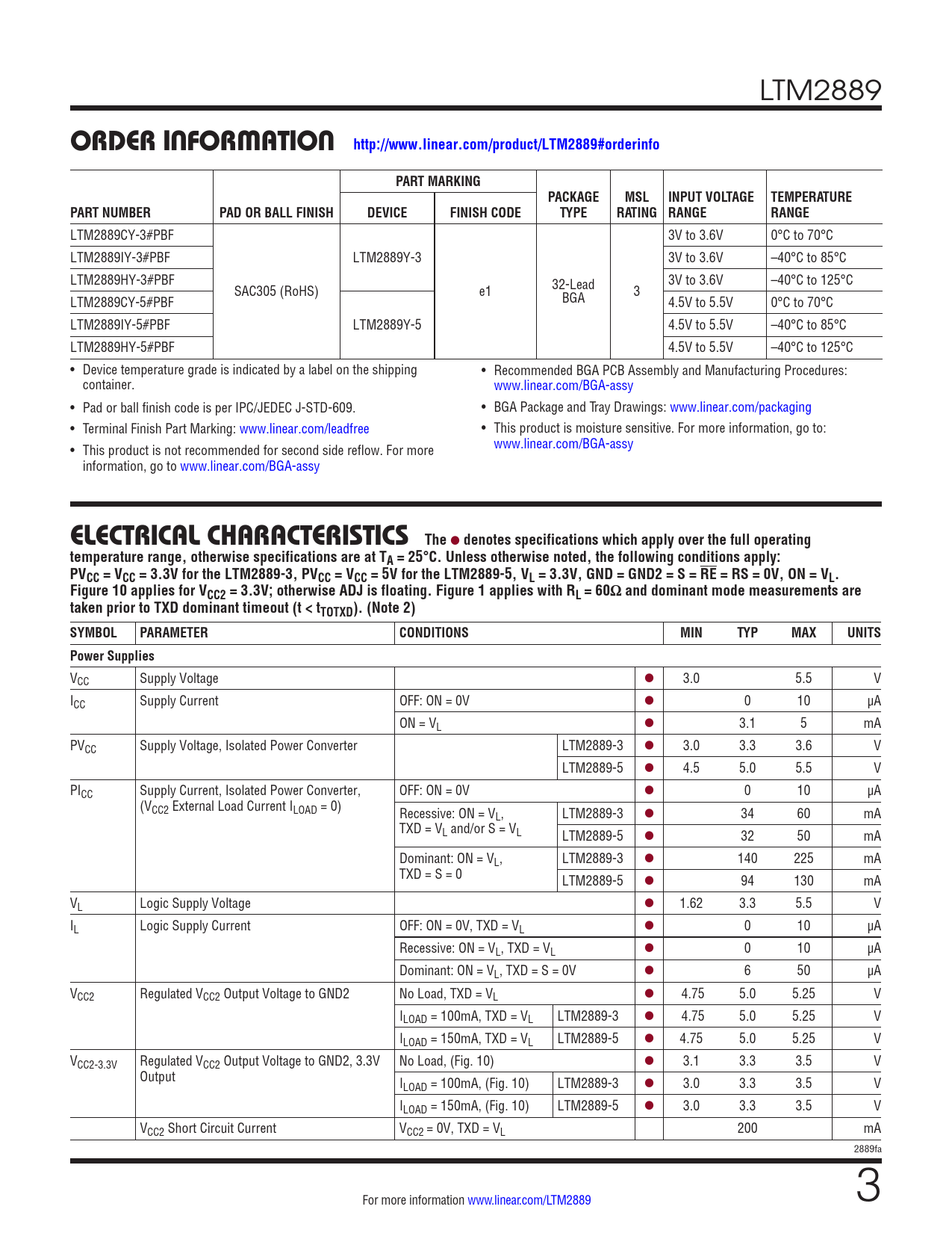LTM2889 ORDER INFORMATION http://www.linear.com/product/LTM2889#orderinfoPART MARKINGPACKAGEMSL INPUT VOLTAGE TEMPERATUREPART NUMBERPAD OR BALL FINISHDEVICEFINISH CODETYPERATING RANGERANGE LTM2889CY-3#PBF 3V to 3.6V 0°C to 70°C LTM2889IY-3#PBF LTM2889Y-3 3V to 3.6V –40°C to 85°C LTM2889HY-3#PBF 3V to 3.6V –40°C to 125°C SAC305 (RoHS) e1 32-Lead BGA 3 LTM2889CY-5#PBF 4.5V to 5.5V 0°C to 70°C LTM2889IY-5#PBF LTM2889Y-5 4.5V to 5.5V –40°C to 85°C LTM2889HY-5#PBF 4.5V to 5.5V –40°C to 125°C • Device temperature grade is indicated by a label on the shipping • Recommended BGA PCB Assembly and Manufacturing Procedures: container. www.linear.com/BGA-assy • Pad or ball finish code is per IPC/JEDEC J-STD-609. • BGA Package and Tray Drawings: www.linear.com/packaging • Terminal Finish Part Marking: www.linear.com/leadfree • This product is moisture sensitive. For more information, go to: • This product is not recommended for second side reflow. For more www.linear.com/BGA-assy information, go to www.linear.com/BGA-assy ELECTRICALCHARACTERISTICS The l denotes specifications which apply over the full operatingtemperature range, otherwise specifications are at TA = 25°C. Unless otherwise noted, the following conditions apply:PVCC = VCC = 3.3V for the LTM2889-3, PVCC = VCC = 5V for the LTM2889-5, VL = 3.3V, GND = GND2 = S = RE = RS = 0V, ON = VL.Figure 10 applies for VCC2 = 3.3V; otherwise ADJ is floating. Figure 1 applies with RL = 60Ω and dominant mode measurements aretaken prior to TXD dominant timeout (t < tTOTXD). (Note 2) SYMBOLPARAMETERCONDITIONSMINTYPMAXUNITSPower Supplies VCC Supply Voltage l 3.0 5.5 V ICC Supply Current OFF: ON = 0V l 0 10 µA ON = VL l 3.1 5 mA PVCC Supply Voltage, Isolated Power Converter LTM2889-3 l 3.0 3.3 3.6 V LTM2889-5 l 4.5 5.0 5.5 V PICC Supply Current, Isolated Power Converter, OFF: ON = 0V l 0 10 µA (VCC2 External Load Current ILOAD = 0) Recessive: ON = VL, LTM2889-3 l 34 60 mA TXD = VL and/or S = VL LTM2889-5 l 32 50 mA Dominant: ON = VL, LTM2889-3 l 140 225 mA TXD = S = 0 LTM2889-5 l 94 130 mA VL Logic Supply Voltage l 1.62 3.3 5.5 V IL Logic Supply Current OFF: ON = 0V, TXD = VL l 0 10 µA Recessive: ON = VL, TXD = VL l 0 10 µA Dominant: ON = VL, TXD = S = 0V l 6 50 µA VCC2 Regulated VCC2 Output Voltage to GND2 No Load, TXD = VL l 4.75 5.0 5.25 V ILOAD = 100mA, TXD = VL LTM2889-3 l 4.75 5.0 5.25 V ILOAD = 150mA, TXD = VL LTM2889-5 l 4.75 5.0 5.25 V VCC2-3.3V Regulated VCC2 Output Voltage to GND2, 3.3V No Load, (Fig. 10) l 3.1 3.3 3.5 V Output ILOAD = 100mA, (Fig. 10) LTM2889-3 l 3.0 3.3 3.5 V ILOAD = 150mA, (Fig. 10) LTM2889-5 l 3.0 3.3 3.5 V VCC2 Short Circuit Current VCC2 = 0V, TXD = VL 200 mA 2889fa For more information www.linear.com/LTM2889 3