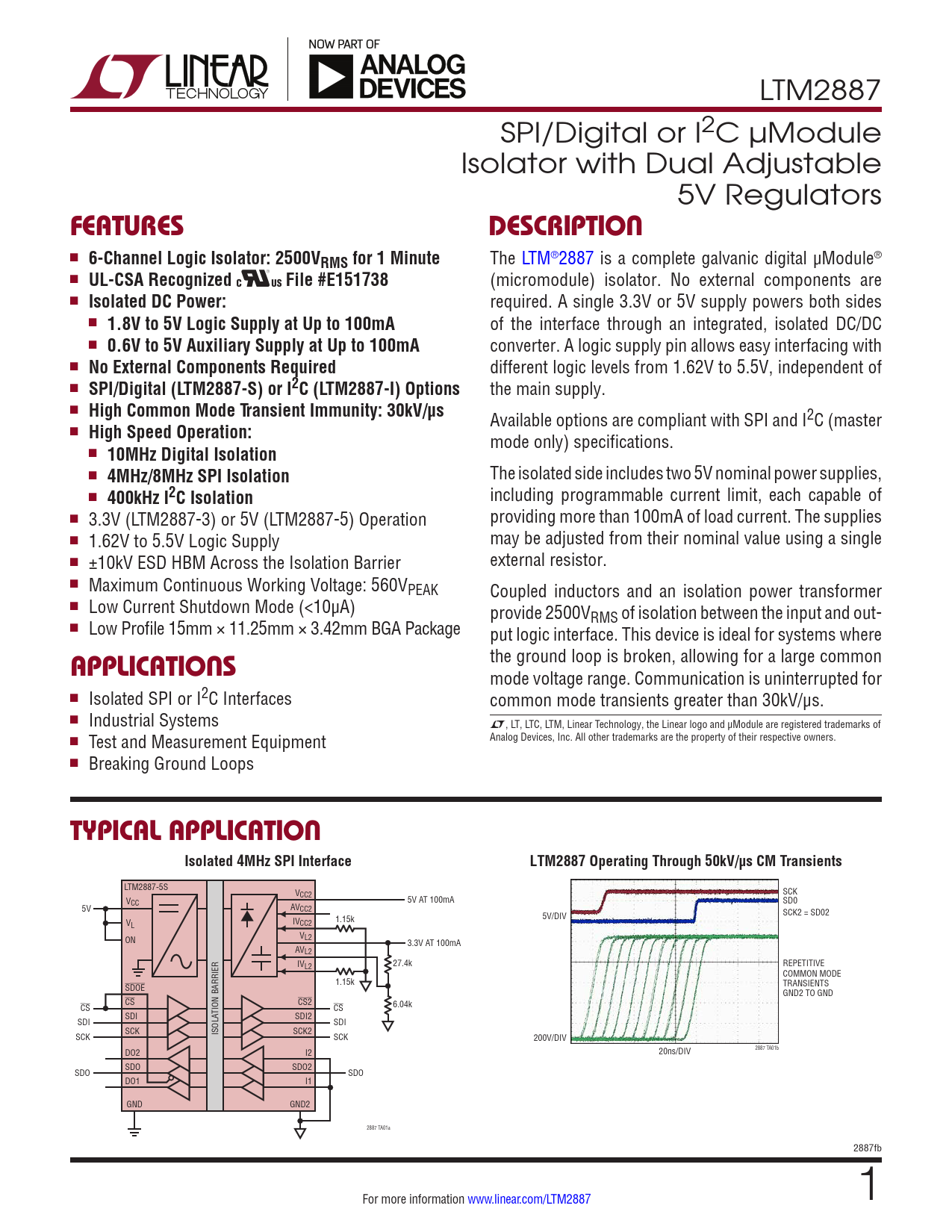 mode voltage range. Communication is uninterrupted for n Isolated SPI or I2C Interfaces common mode transients greater than 30kV/μs. n Industrial Systems L, LT, LTC, LTM, Linear Technology, the Linear logo and µModule are registered trademarks of Analog Devices, Inc. All other trademarks are the property of their respective owners. n Test and Measurement Equipment n Breaking Ground Loops