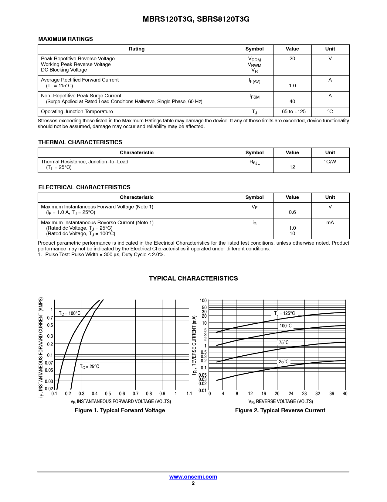 Peak Repetitive Reverse Voltage VRRM 20 V Working Peak Reverse Voltage VRWM DC Blocking Voltage VR Average Rectified Forward Current IF(AV) A (TL = 115°C) 1.0 Non−Repetitive Peak Surge Current IFSM A (Surge Applied at Rated Load Conditions Halfwave, Single Phase, 60 Hz) 40 Operating Junction Temperature TJ −65 to +125 °C Stresses exceeding those listed in the Maximum Ratings table may damage the device. If any of these limits are exceeded, device functionality should not be assumed, damage may occur and reliability may be affected.
