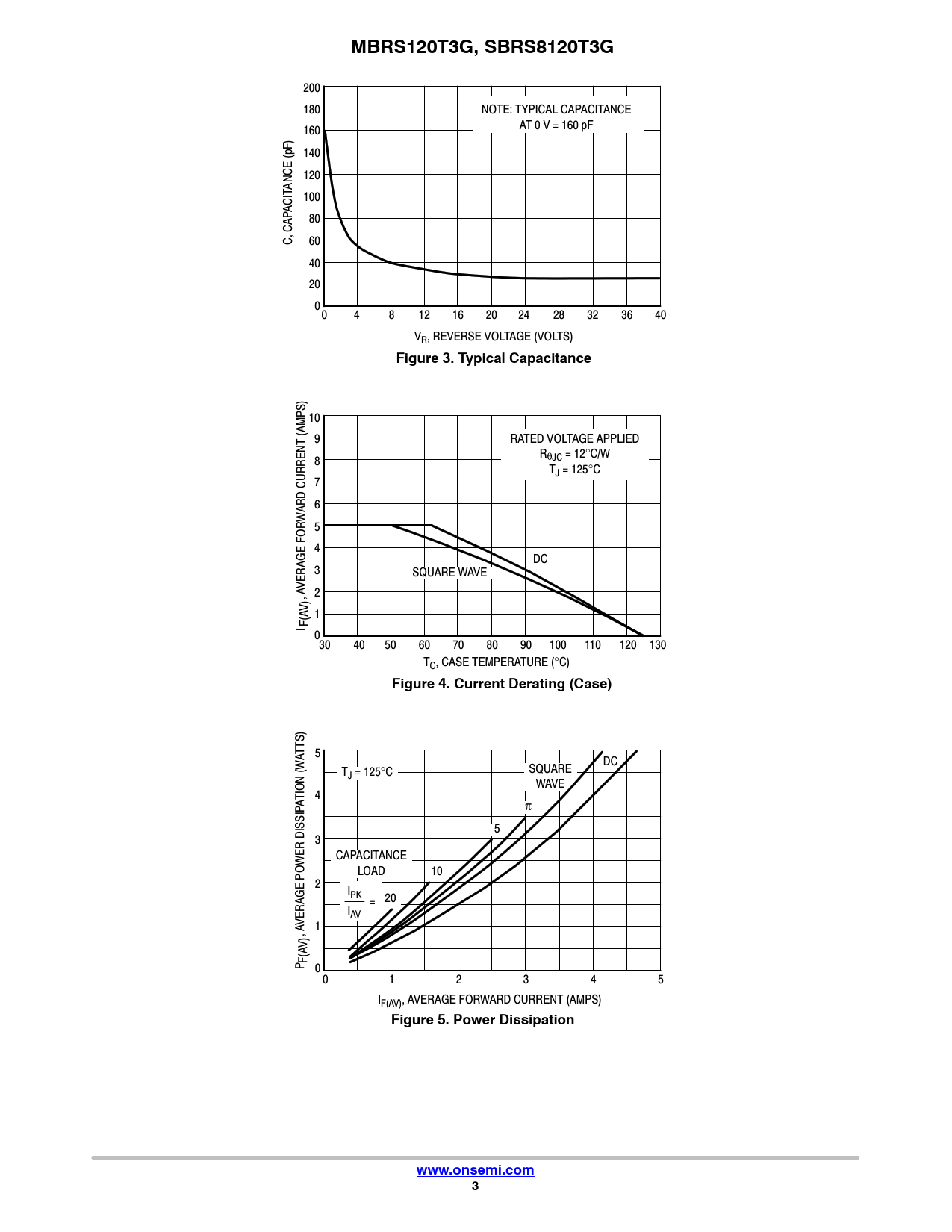 MBRS120T3G, SBRS8120T3G. Figure 3. Typical Capacitance. Figure 4. Current Derating (Case). Figure 5. Power Dissipation