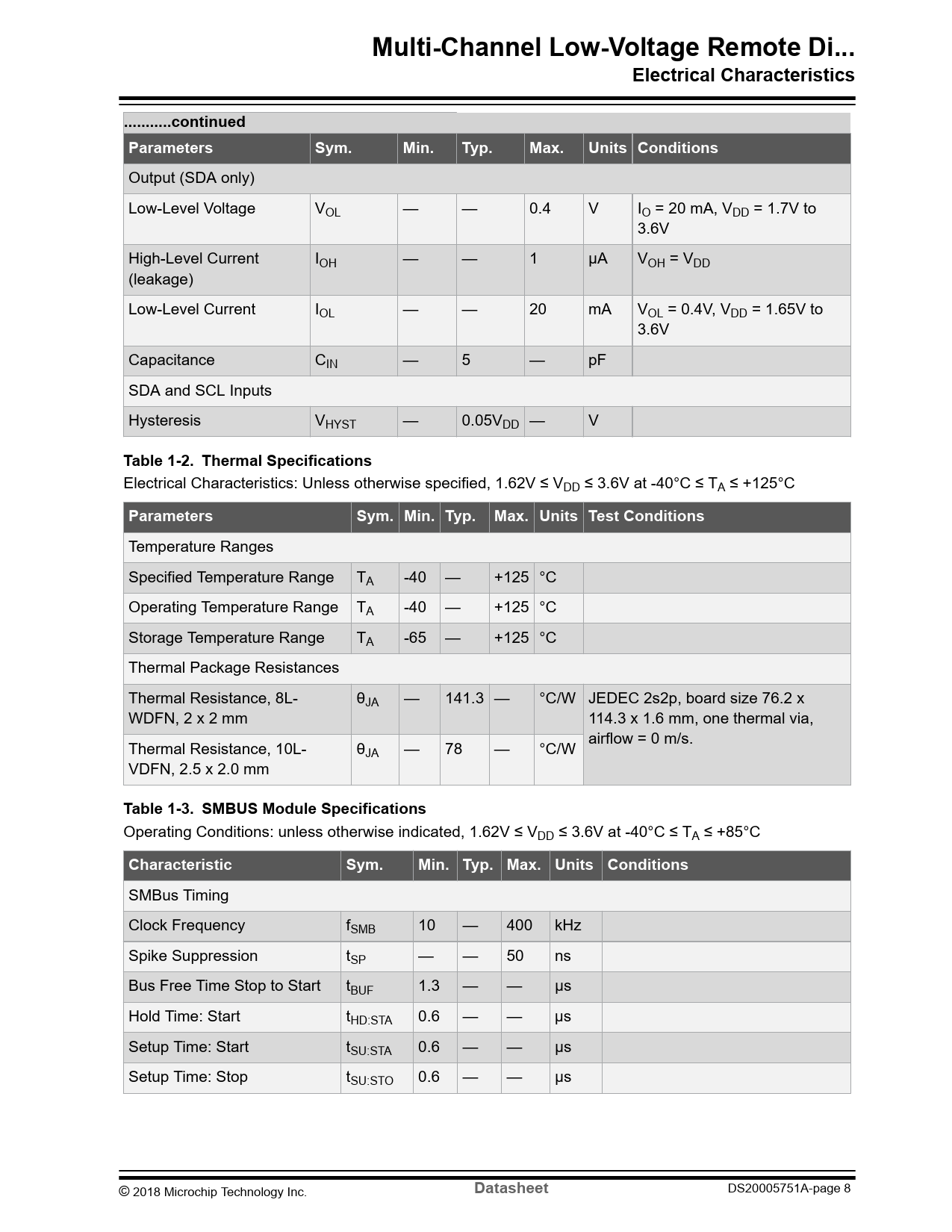 SMBus Timing Clock Frequency fSMB 10 — 400 kHz Spike Suppression tSP — — 50 ns Bus Free Time Stop to Start tBUF 1.3 — — µs Hold Time: Start tHD:STA 0.6 — — µs Setup Time: Start tSU:STA 0.6 — — µs Setup Time: Stop tSU:STO 0.6 — — µs © 2018 Microchip Technology Inc.