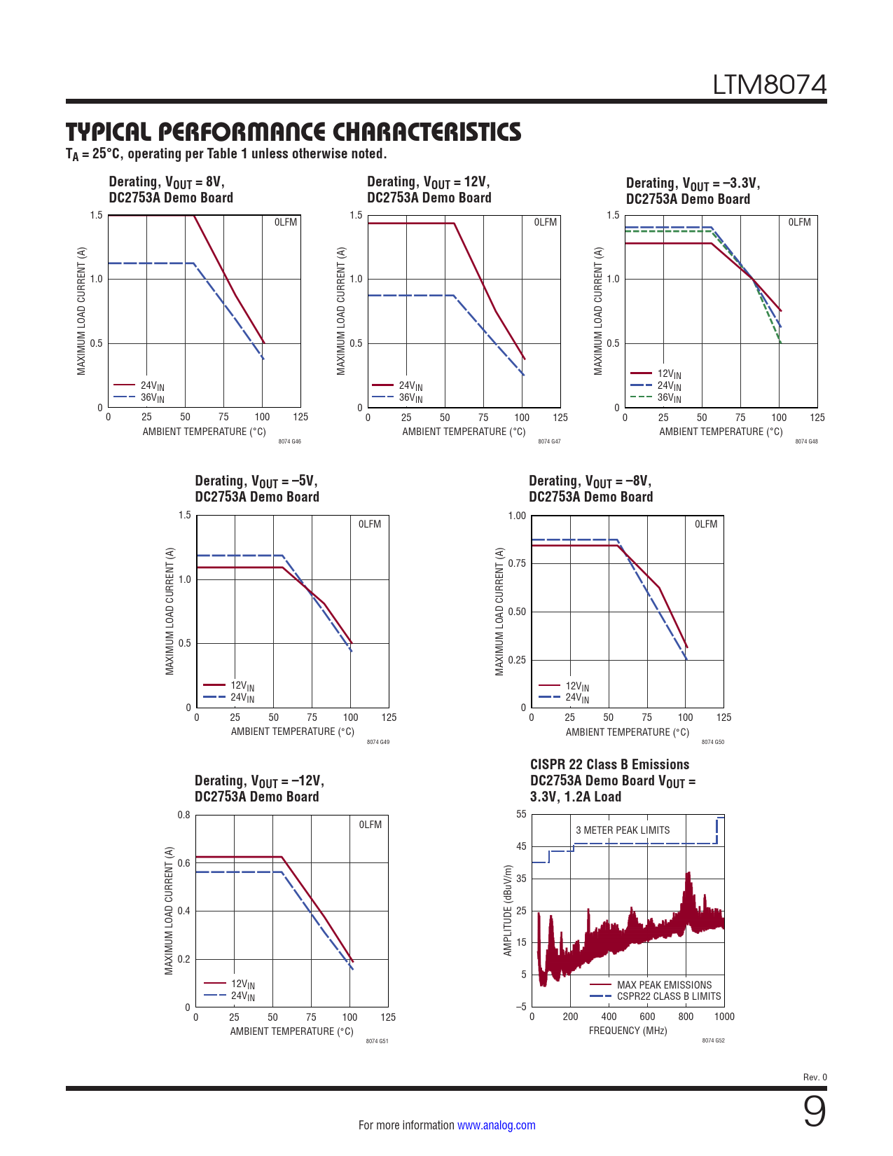 TYPICAL PERFORMANCE CHARACTERISTICS TA = 25°C, operating per Table 1 unless otherwise noted. Derating, VOUT = 8V, Derating, VOUT = 12V, Derating, VOUT = –3.3V, DC2753A Demo Board DC2753A Demo Board DC2753A Demo Board