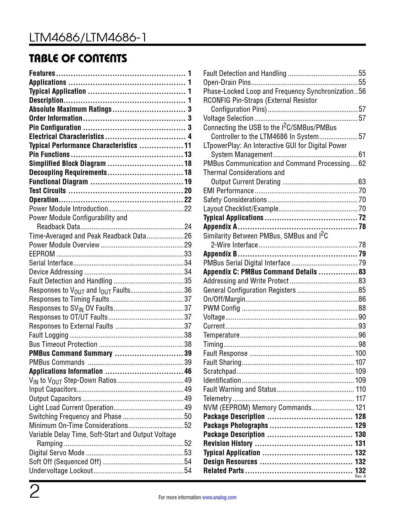 Rev. A 2 For more information www.analog.com Document Outline Features Applications Typical Application Description Absolute Maximum Ratings Order Information Pin Configuration Electrical Characteristics Typical Performance Characteristics Pin Functions Simplified Block Diagram Decoupling Requirements Functional Diagram Test Circuits Operation Power Module Introduction Power Module Configurability and Readback Data Time-Averaged and Peak Readback Data Power Module Overview EEPROM Serial Interface Device Addressing Fault Detection and Handling Responses to VOUT and IOUT Faults Responses to Timing Faults Responses to SVIN OV Faults Responses to OT/UT Faults Responses to External Faults Fault Logging Bus Timeout Protection PMBus Command Summary PMBus Commands Applications Information VIN to VOUT Step-Down Ratios Input Capacitors Output Capacitors Light Load Current Operation Switching Frequency and Phase Minimum On-Time Considerations Variable Delay Time, Soft-Start and Output Voltage Ramping Digital Servo Mode Soft Off (Sequenced Off) Undervoltage Lockout Fault Detection and Handling Open-Drain Pins Phase-Locked Loop and Frequency Synchronization RCONFIG Pin-Straps (External Resistor Configuration Pins) Voltage Selection Connecting the USB to the I2C/SMBus/PMBus Controller to the LTM4686 In System LTpowerPlay: An Interactive GUI for Digital Power System Management PMBus Communication and Command Processing Thermal Considerations and Output Current Derating EMI Performance Safety Considerations Layout Checklist/Example Typical Applications Appendix A Similarity Between PMBus, SMBus and I2C 2-Wire Interface Appendix B PMBus Serial Digital Interface Appendix C: PMBus Command Details Addressing and Write Protect General Configuration Registers On/Off/Margin PWM Config Voltage Current Temperature Timing Fault Response Fault Sharing Scratchpad Identification Fault Warning and Status Telemetry NVM (EEPROM) Memory Commands Package Description Package Photographs Package Description Revision History Typical Application Design Resources Related Parts