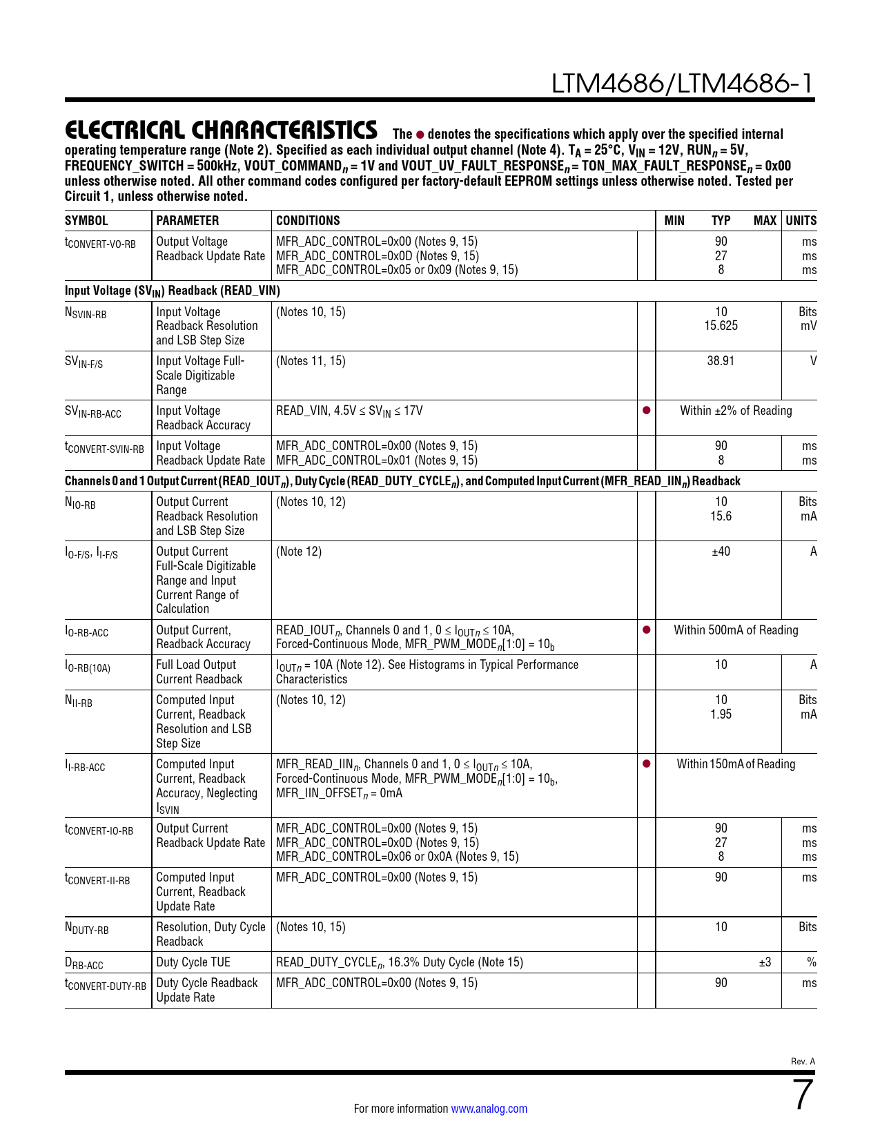 tCONVERT-VO-RB Output Voltage MFR_ADC_CONTROL=0x00 (Notes 9, 15) 90 ms Readback Update Rate MFR_ADC_CONTROL=0x0D (Notes 9, 15) 27 ms MFR_ADC_CONTROL=0x05 or 0x09 (Notes 9, 15) 8 ms