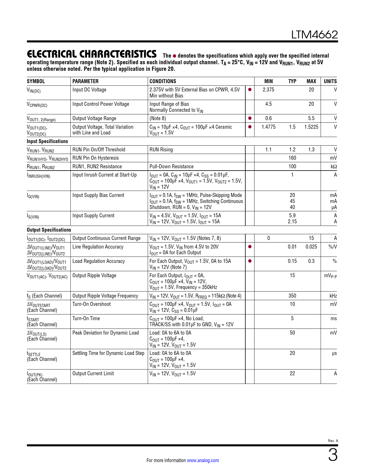 VIN(DC) Input DC Voltage 2.375V with 5V External Bias on CPWR, 4.5V l 2.375 20 V Min without Bias VCPWR(DC) Input Control Power Voltage Input Range of Bias 4.5 20 V Normally Connected to VIN VOUT1, 2(Range) Output Voltage Range (Note 8) l 0.6 5.5 V VOUT1(DC), Output Voltage, Total Variation CIN = 10µF ×4, COUT = 100µF ×4 Ceramic l 1.4775 1.5 1.5225 V VOUT2(DC) with Line and Load VOUT = 1.5V