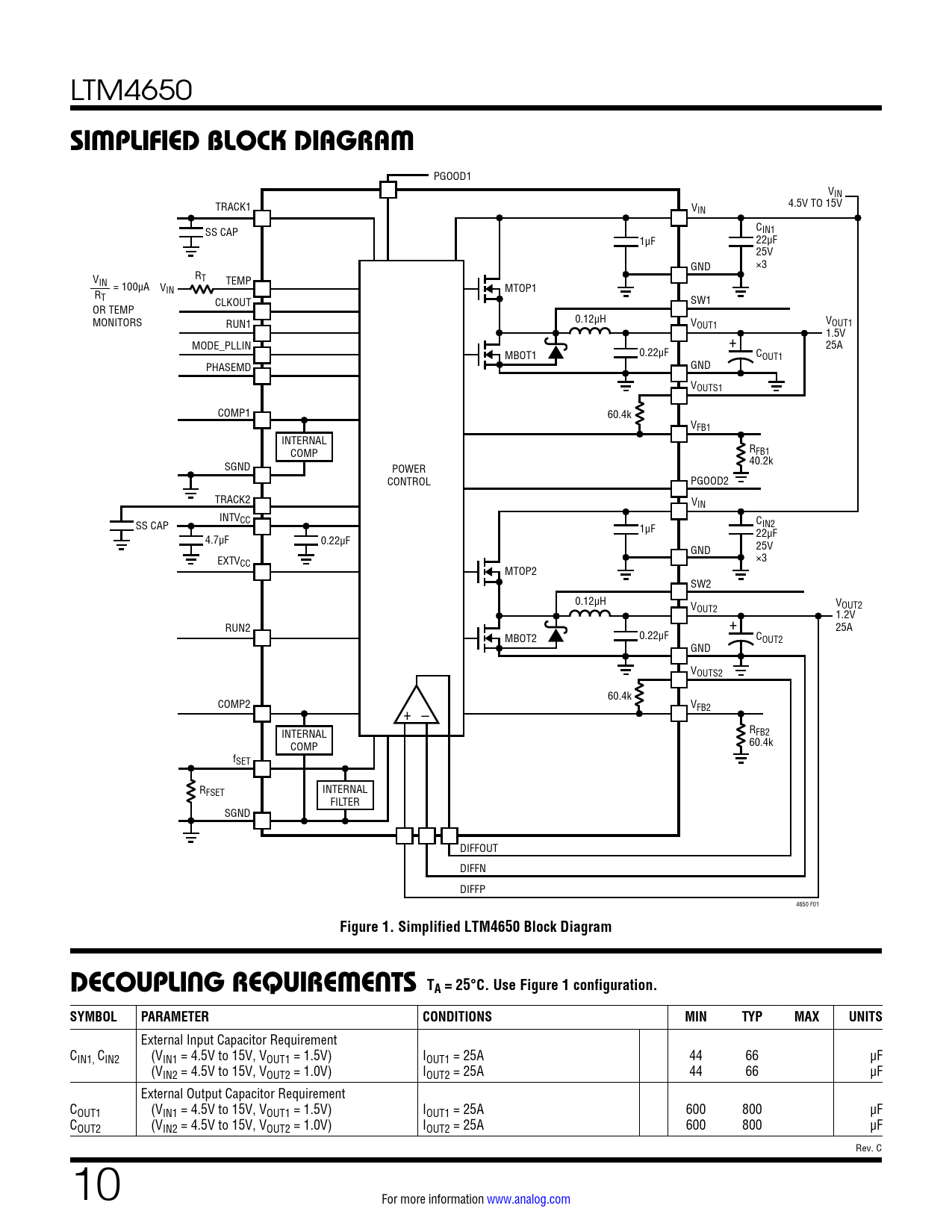 Figure 1. Simplified LTM4650 Block Diagram DECOUPLING REQUIREMENTS TA = 25°C. Use Figure 1 configuration. SYMBOL PARAMETER CONDITIONS MIN TYP MAX UNITS