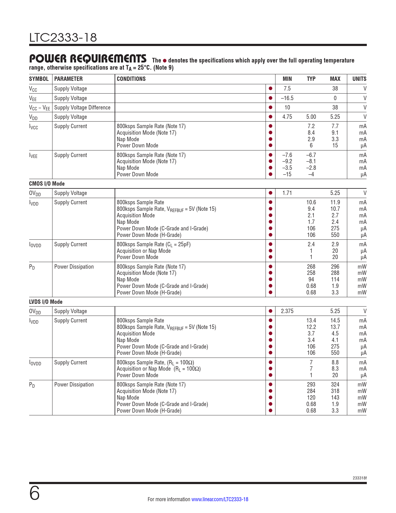 LTC2333-18 POWERREQUIREMENTS The l denotes the specifications which apply over the full operating temperaturerange, otherwise specifications are at TA = 25°C. (Note 9) SYMBOL PARAMETERCONDITIONSMINTYPMAXUNITS VCC Supply Voltage l 7.5 38 V VEE Supply Voltage l –16.5 0 V VCC − VEE Supply Voltage Difference l 10 38 V VDD Supply Voltage l 4.75 5.00 5.25 V IVCC Supply Current 800ksps Sample Rate (Note 17) l 7.2 7.7 mA Acquisition Mode (Note 17) l 8.4 9.1 mA Nap Mode l 2.9 3.3 mA Power Down Mode l 6 15 μA IVEE Supply Current 800ksps Sample Rate (Note 17) l –7.6 –6.7 mA Acquisition Mode (Note 17) l –9.2 –8.1 mA Nap Mode l –3.5 –2.8 mA Power Down Mode l –15 –4 μA CMOS I/O Mode OVDD Supply Voltage l 1.71 5.25 V IVDD Supply Current 800ksps Sample Rate l 10.6 11.9 mA 800ksps Sample Rate, VREFBUF = 5V (Note 15) l 9.4 10.7 mA Acquisition Mode l 2.1 2.7 mA Nap Mode l 1.7 2.4 mA Power Down Mode (C-Grade and I-Grade) l 106 275 μA Power Down Mode (H-Grade) l 106 550 µA IOVDD Supply Current 800ksps Sample Rate (CL = 25pF) l 2.4 2.9 mA Acquisition or Nap Mode l 1 20 μA Power Down Mode l 1 20 μA PD Power Dissipation 800ksps Sample Rate (Note 17) l 268 296 mW Acquisition Mode (Note 17) l 258 288 mW Nap Mode l 94 114 mW Power Down Mode (C-Grade and I-Grade) l 0.68 1.9 mW Power Down Mode (H-Grade) l 0.68 3.3 mW LVDS I/O Mode OVDD Supply Voltage l 2.375 5.25 V IVDD Supply Current 800ksps Sample Rate l 13.4 14.5 mA 800ksps Sample Rate, VREFBUF = 5V (Note 15) l 12.2 13.7 mA Acquisition Mode l 3.7 4.5 mA Nap Mode l 3.4 4.1 mA Power Down Mode (C-Grade and I-Grade) l 106 275 μA Power Down Mode (H-Grade) l 106 550 µA IOVDD Supply Current 800ksps Sample Rate, (RL = 100Ω) l 7 8.8 mA Acquisition or Nap Mode (RL = 100Ω) l 7 8.3 mA Power Down Mode l 1 20 μA PD Power Dissipation 800ksps Sample Rate (Note 17) l 293 324 mW Acquisition Mode (Note 17) l 284 318 mW Nap Mode l 120 143 mW Power Down Mode (C-Grade and I-Grade) l 0.68 1.9 mW Power Down Mode (H-Grade) l 0.68 3.3 mW 233318f 6 For more information www.linear.com/LTC2333-18