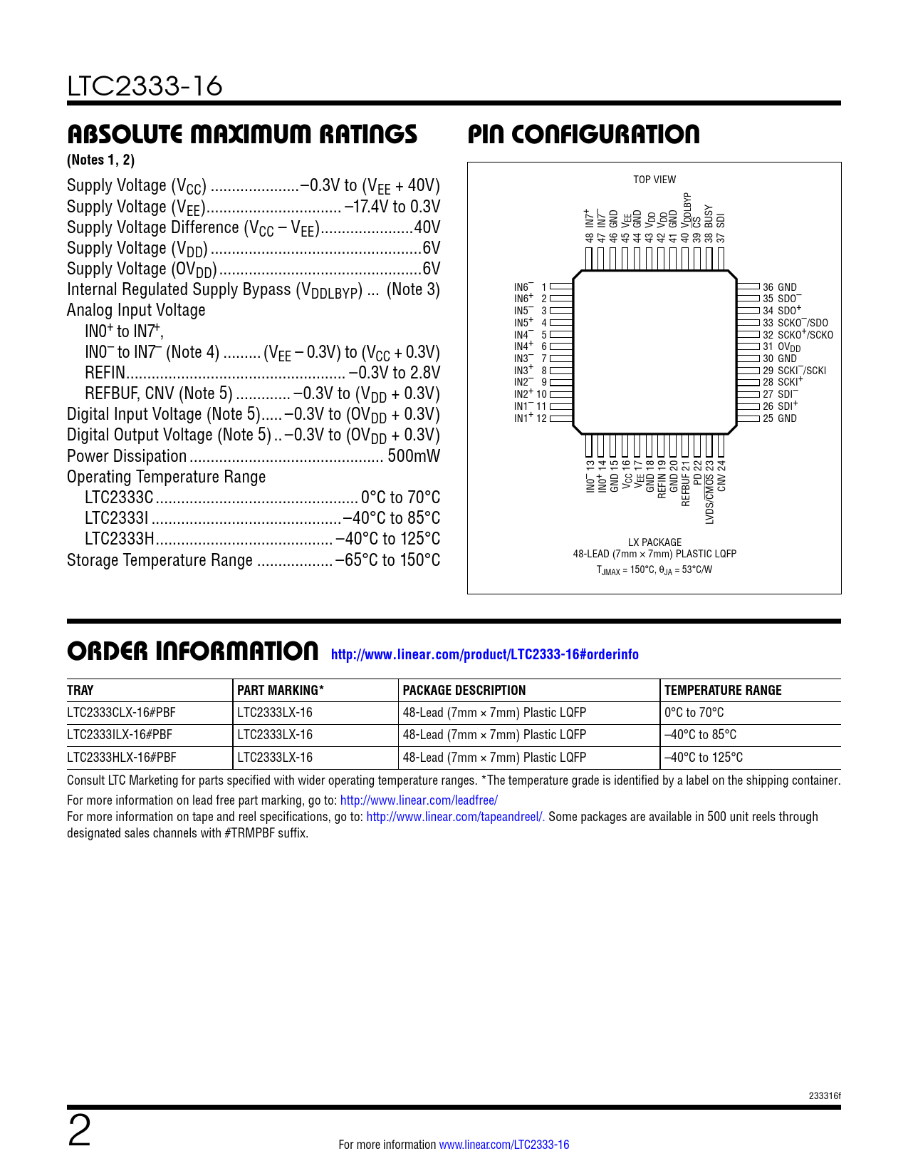 LTC2333-16 absoluTe MaxiMuM raTingspin conFiguraTion(Notes 1, 2) Supply Voltage (V TOP VIEW CC) ...–0.3V to (VEE + 40V) Supply Voltage (VEE) .. –17.4V to 0.3V + – Supply Voltage Difference (VCC – VEE) ..40V IN7 IN7 GND V EE GND V DD V DD GND V DDLBYP CS BUSY SDI Supply Voltage (V 48 47 46 45 44 43 42 41 40 39 38 37 DD) ..6V Supply Voltage (OVDD) ..6V Internal Regulated Supply Bypass (VDDLBYP) ... (Note 3) IN6– 1 36 GND Analog Input Voltage IN6+ 2 35 SDO– IN5– 3 34 SDO+ IN0+ to IN7+, IN5+ 4 33 SCKO–/SDO IN4– 5 32 SCKO+/SCKO IN0– to IN7– (Note 4) ...(V IN4+ 6 31 OV EE – 0.3V) to (VCC + 0.3V) DD IN3– 7 30 GND REFIN .. –0.3V to 2.8V IN3+ 8 29 SCKI–/SCKI REFBUF, CNV (Note 5) ... –0.3V to (V IN2– 9 28 SCKI+ DD + 0.3V) IN2+ 10 27 SDI– Digital Input Voltage (Note 5) ... –0.3V to (OV IN1– 11 26 SDI+ DD + 0.3V) IN1+ 12 25 GND Digital Output Voltage (Note 5) .. –0.3V to (OVDD + 0.3V) Power Dissipation .. 500mW Operating Temperature Range 13 14 15 16 17 18 19 20 21 22 23 24 – + PD LTC2333C .. 0°C to 70°C IN0 IN0 GND V CC V EE GND CNV REFIN GND CMOS REFBUF LTC2333I ...–40°C to 85°C LVDS/ LTC2333H .. –40°C to 125°C LX PACKAGE Storage Temperature Range .. –65°C to 150°C 48-LEAD (7mm × 7mm) PLASTIC LQFP TJMAX = 150°C, θJA = 53°C/W orDer inForMaTion http://www.linear.com/product/LTC2333-16#orderinfoTRAYPART MARKING*PACKAGE DESCRIPTIONTEMPERATURE RANGE LTC2333CLX-16#PBF LTC2333LX-16 48-Lead (7mm × 7mm) Plastic LQFP 0°C to 70°C LTC2333ILX-16#PBF LTC2333LX-16 48-Lead (7mm × 7mm) Plastic LQFP –40°C to 85°C LTC2333HLX-16#PBF LTC2333LX-16 48-Lead (7mm × 7mm) Plastic LQFP –40°C to 125°C Consult LTC Marketing for parts specified with wider operating temperature ranges. *The temperature grade is identified by a label on the shipping container. For more information on lead free part marking, go to: http://www.linear.com/leadfree/ For more information on tape and reel specifications, go to: http://www.linear.com/tapeandreel/. Some packages are available in 500 unit reels through designated sales channels with #TRMPBF suffix. 233316f 2 For more information www.linear.com/LTC2333-16 Document Outline Features Description Applications Typical Application Absolute Maximum Ratings Pin Configuration Order Information Electrical Characteristics Converter Characteristics Dynamic Accuracy Internal Reference Characteristics Reference Buffer Characteristics Digital Inputs and Digital Outputs Power Requirements ADC Timing Characteristics Typical Performance Characteristics Pin Functions Configuration Tables Functional Block Diagram Timing Diagram Applications Information Board Layout Package Description Typical Application Related Parts