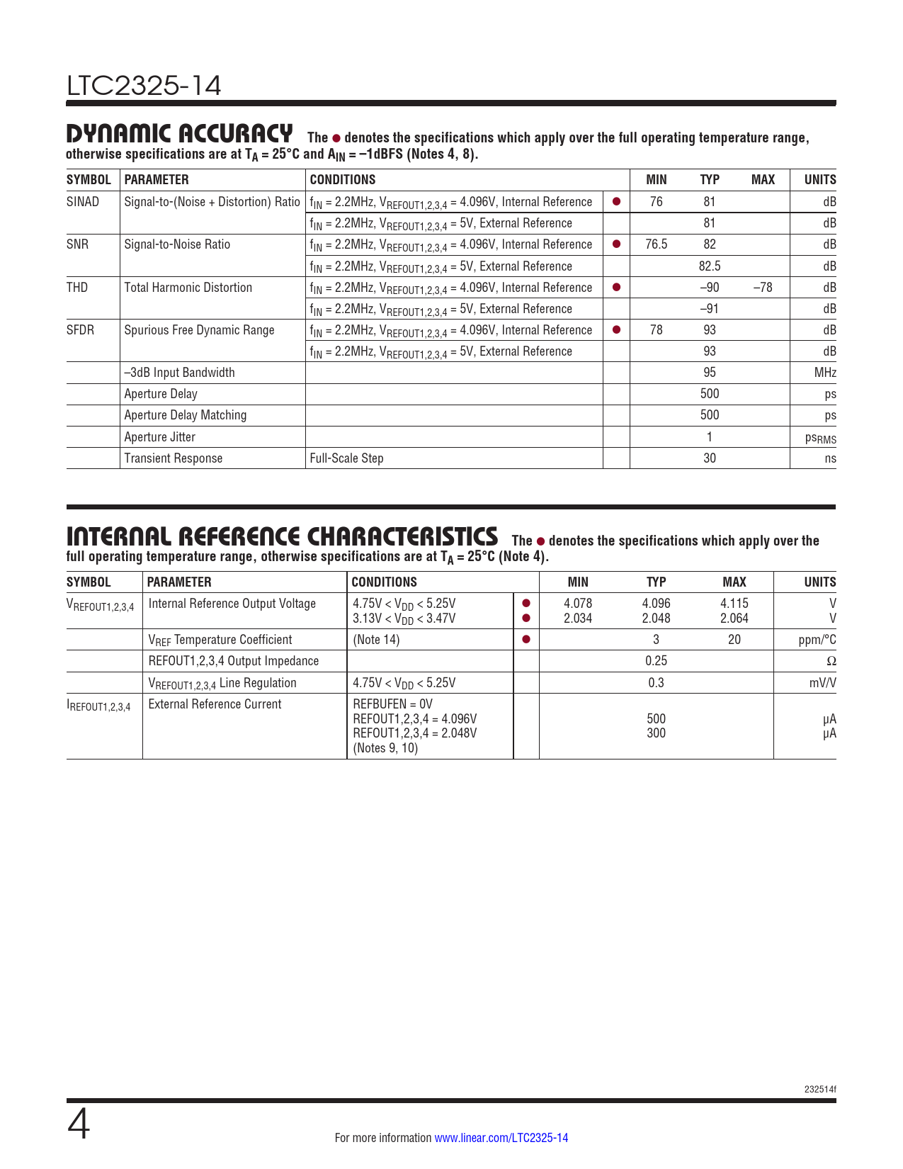 LTC2325-14 DynaMic accuracyThe l denotes the specifications which apply over the full operating temperature range,otherwise specifications are at TA = 25°C and AIN = –1dBFS (Notes 4, 8).SYMBOL PARAMETERCONDITIONSMINTYPMAXUNITS SINAD Signal-to-(Noise + Distortion) Ratio fIN = 2.2MHz, VREFOUT1,2,3,4 = 4.096V, Internal Reference l 76 81 dB fIN = 2.2MHz, VREFOUT1,2,3,4 = 5V, External Reference 81 dB SNR Signal-to-Noise Ratio fIN = 2.2MHz, VREFOUT1,2,3,4 = 4.096V, Internal Reference l 76.5 82 dB fIN = 2.2MHz, VREFOUT1,2,3,4 = 5V, External Reference 82.5 dB THD Total Harmonic Distortion fIN = 2.2MHz, VREFOUT1,2,3,4 = 4.096V, Internal Reference l –90 –78 dB fIN = 2.2MHz, VREFOUT1,2,3,4 = 5V, External Reference –91 dB SFDR Spurious Free Dynamic Range fIN = 2.2MHz, VREFOUT1,2,3,4 = 4.096V, Internal Reference l 78 93 dB fIN = 2.2MHz, VREFOUT1,2,3,4 = 5V, External Reference 93 dB –3dB Input Bandwidth 95 MHz Aperture Delay 500 ps Aperture Delay Matching 500 ps Aperture Jitter 1 psRMS Transient Response Full-Scale Step 30 ns inTernal reFerence characTerisTicsThe l denotes the specifications which apply over thefull operating temperature range, otherwise specifications are at TA = 25°C (Note 4). SYMBOLPARAMETERCONDITIONSMINTYPMAXUNITS VREFOUT1,2,3,4 Internal Reference Output Voltage 4.75V < VDD < 5.25V l 4.078 4.096 4.115 V 3.13V < VDD < 3.47V l 2.034 2.048 2.064 V VREF Temperature Coefficient (Note 14) l 3 20 ppm/°C REFOUT1,2,3,4 Output Impedance 0.25 Ω VREFOUT1,2,3,4 Line Regulation 4.75V < VDD < 5.25V 0.3 mV/V IREFOUT1,2,3,4 External Reference Current REFBUFEN = 0V REFOUT1,2,3,4 = 4.096V 500 μA REFOUT1,2,3,4 = 2.048V 300 μA (Notes 9, 10) 232514f 4 For more information www.linear.com/LTC2325-14 Document Outline Features Applications Typical Application Description Absolute Maximum Ratings Order Information Pin Configuration Electrical Characteristics Converter Characteristics Dynamic Accuracy Internal Reference Characteristics Digital Inputs And Digital Outputs Power Requirements ADC Timing Characteristics Typical Performance Characteristics Pin Functions Functional Block Diagram Timing Diagram Applications Information Package Description Typical Application Related Parts