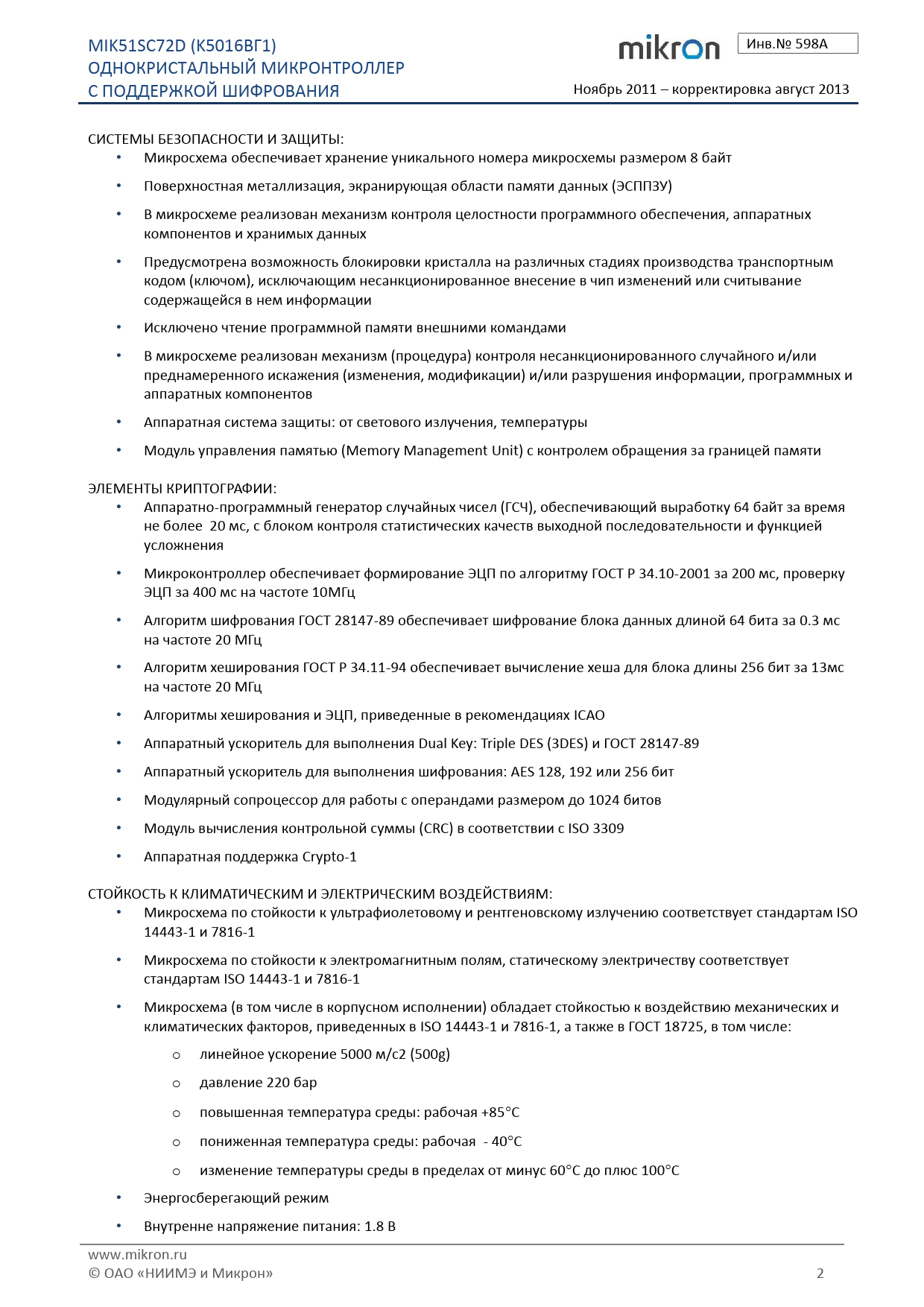 MIK51SC72D. (K5016ВГ1). Инв.№. 598А. ОДНОКРИСТАЛЬНЫЙ. МИКРОНТРОЛЛЕР. С. ПОДДЕРЖКОЙ. ШИФРОВАНИЯ. Ноябрь. 2011. –. корректировка. август. 2013. СИСТЕМЫ