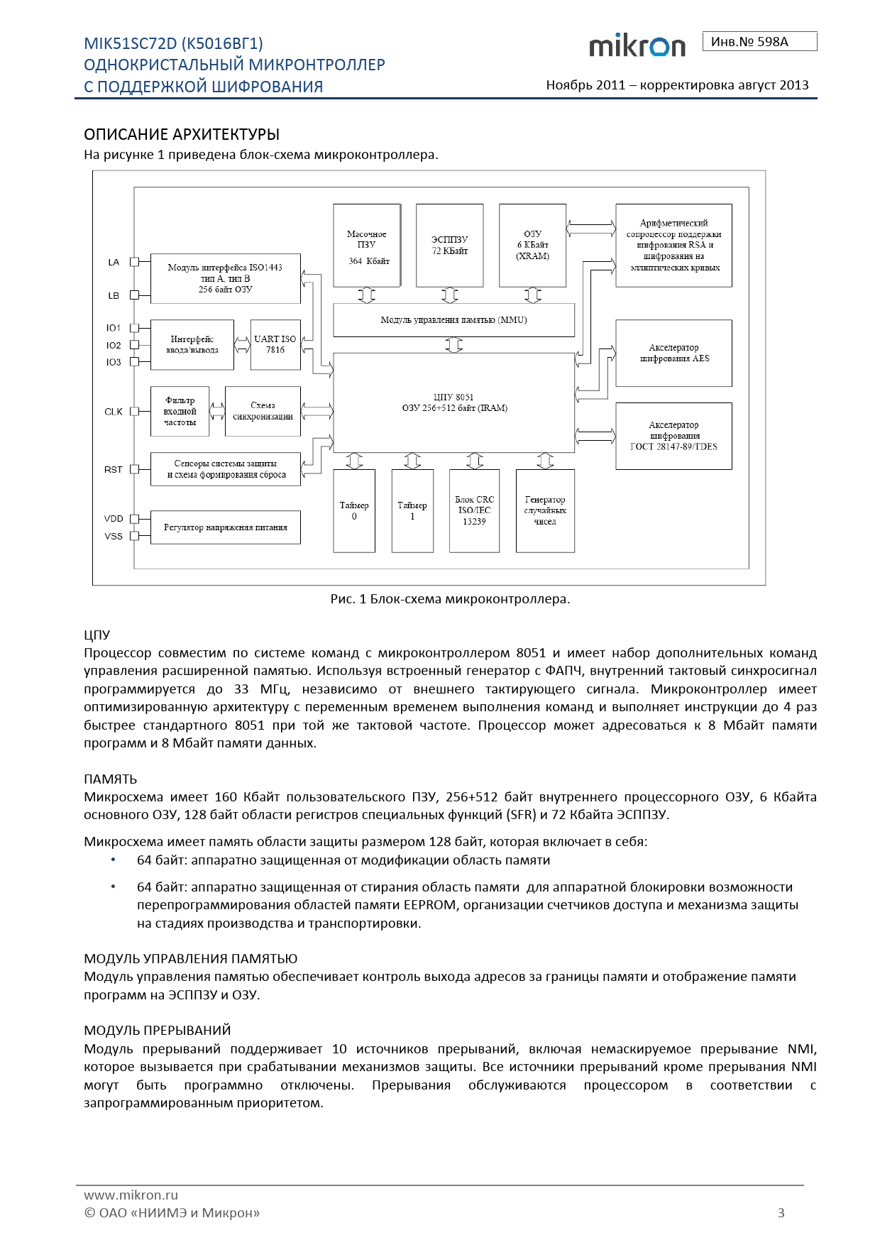 MIK51SC72D. (K5016ВГ1). Инв.№. 598А. ОДНОКРИСТАЛЬНЫЙ. МИКРОНТРОЛЛЕР. С. ПОДДЕРЖКОЙ. ШИФРОВАНИЯ. Ноябрь. 2011. –. корректировка. август. 2013
