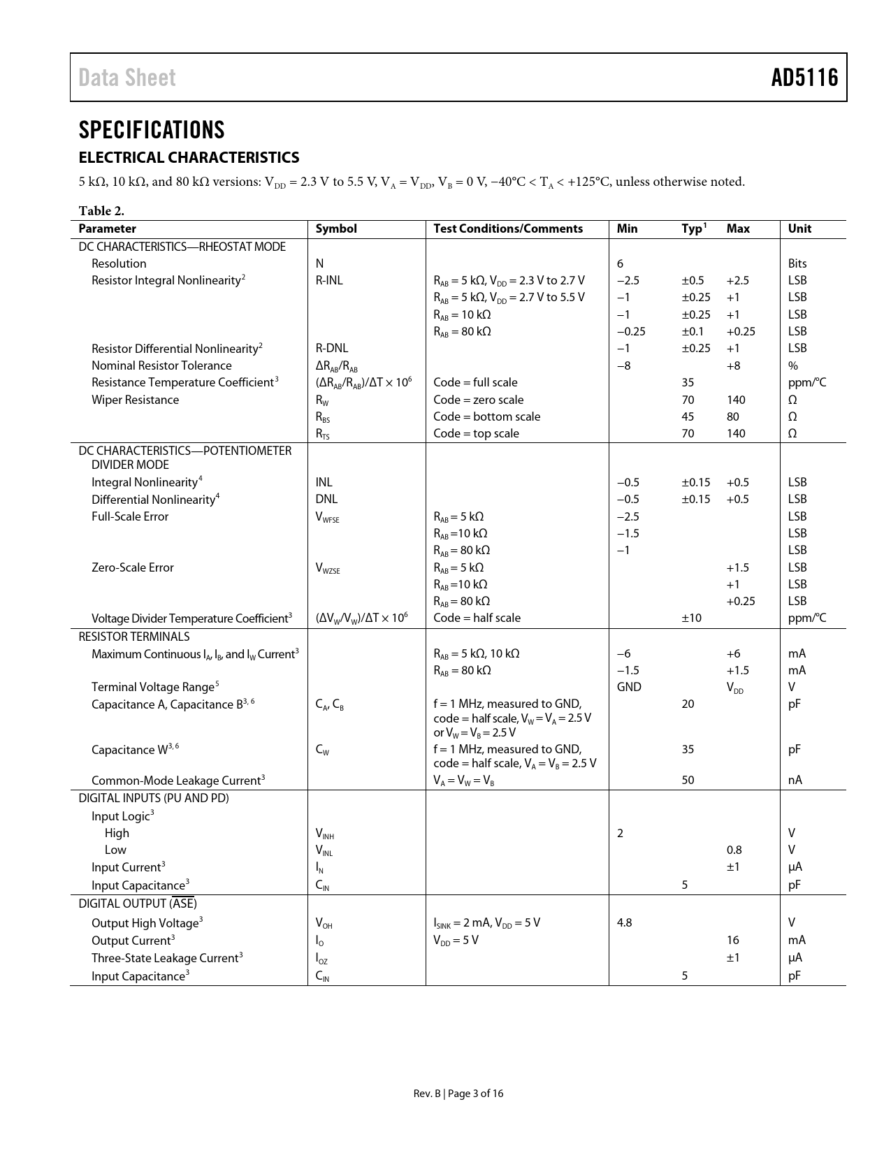 Data Sheet. AD5116. SPECIFICATIONS ELECTRICAL CHARACTERISTICS. Table 2. Parameter. Symbol. Test Conditions/Comments. Min. Typ1. Max. Unit