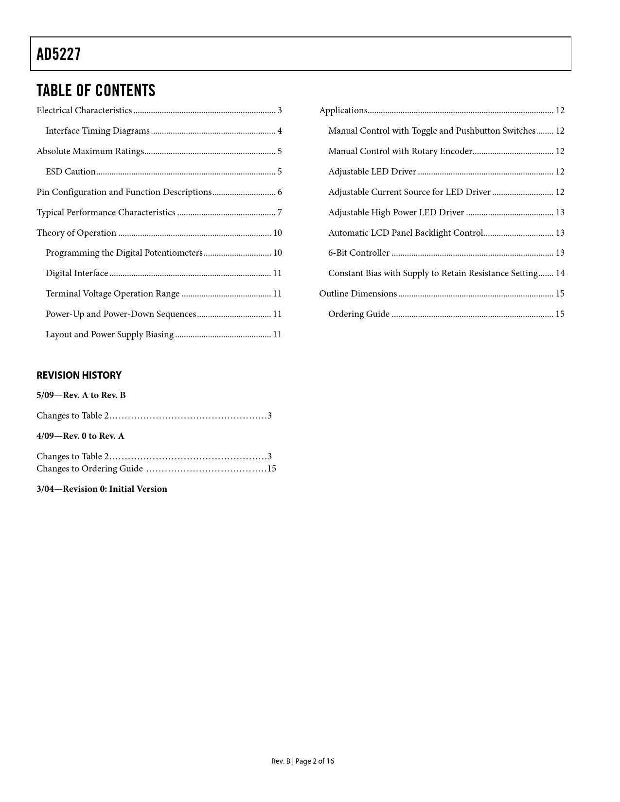 Seiten / Seite16 / 2 — AD5227. TABLE OF CONTENTS. REVISION HISTORY. 5/09—Rev. A to Rev. B. …