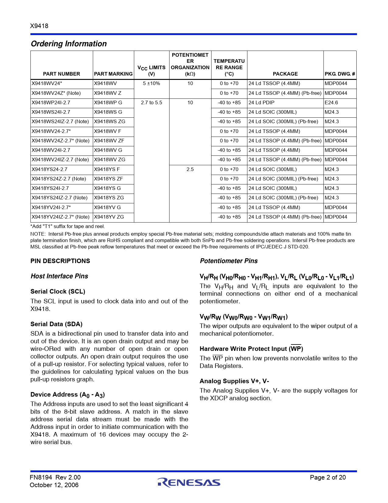 X9418 Ordering InformationPOTENTIOMETERTEMPERATUVCC LIMITS ORGANIZATION RE RANGEPART NUMBERPART MARKING(V)(k)(°C)PACKAGEPKG. DWG. # X9418WV24* X9418WV 5 ±10% 10 0 to +70 24 Ld TSSOP (4.4MM) MDP0044 X9418WV24Z* (Note) X9418WV Z 0 to +70 24 Ld TSSOP (4.4MM) (Pb-free) MDP0044 X9418WP24I-2.7 X9418WP G 2.7 to 5.5 10 -40 to +85 24 Ld PDIP E24.6 X9418WS24I-2.7 X9418WS G -40 to +85 24 Ld SOIC (300MIL) M24.3 X9418WS24IZ-2.7 (Note) X9418WS ZG -40 to +85 24 Ld SOIC (300MIL) (Pb-free) M24.3 X9418WV24-2.7* X9418WV F 0 to +70 24 Ld TSSOP (4.4MM) MDP0044 X9418WV24Z-2.7* (Note) X9418WV ZF 0 to +70 24 Ld TSSOP (4.4MM) (Pb-free) MDP0044 X9418WV24I-2.7 X9418WV G -40 to +85 24 Ld TSSOP (4.4MM) MDP0044 X9418WV24IZ-2.7 (Note) X9418WV ZG -40 to +85 24 Ld TSSOP (4.4MM) (Pb-free) MDP0044 X9418YS24-2.7 X9418YS F 2.5 0 to +70 24 Ld SOIC (300MIL) M24.3 X9418YS24Z-2.7 (Note) X9418YS ZF 0 to +70 24 Ld SOIC (300MIL) (Pb-free) M24.3 X9418YS24I-2.7 X9418YS G -40 to +85 24 Ld SOIC (300MIL) M24.3 X9418YS24IZ-2.7 (Note) X9418YS ZG -40 to +85 24 Ld SOIC (300MIL) (Pb-free) M24.3 X9418YV24I-2.7* X9418YV G -40 to +85 24 Ld TSSOP (4.4MM) MDP0044 X9418YV24IZ-2.7* (Note) X9418YV ZG -40 to +85 24 Ld TSSOP (4.4MM) (Pb-free) MDP0044 *Add "T1" suffix for tape and reel. NOTE: Intersil Pb-free plus anneal products employ special Pb-free material sets; molding compounds/die attach materials and 100% matte tin plate termination finish, which are RoHS compliant and compatible with both SnPb and Pb-free soldering operations. Intersil Pb-free products are MSL classified at Pb-free peak reflow temperatures that meet or exceed the Pb-free requirements of IPC/JEDEC J STD-020. PIN DESCRIPTIONSPotentiometer PinsHost Interface PinsVH/RH (VH0/RH0 - VH1/RH1), VL/RL (VL0/RL0 - VL1/RL1) The VH/RH and VL/RL inputs are equivalent to the Serial Clock (SCL) terminal connections on either end of a mechanical The SCL input is used to clock data into and out of the potentiometer. X9418. VW/RW (VW0/RW0 - VW1/RW1)Serial Data (SDA) The wiper outputs are equivalent to the wiper output of a SDA is a bidirectional pin used to transfer data into and mechanical potentiometer. out of the device. It is an open drain output and may be wire-ORed with any number of open drain or open Hardware Write Protect Input (WP) collector outputs. An open drain output requires the use The WP pin when low prevents nonvolatile writes to the of a pull-up resistor. For selecting typical values, refer to Data Registers. the guidelines for calculating typical values on the bus pull-up resistors graph. Analog Supplies V+, V- The Analog Supplies V+, V- are the supply voltages for Device Address (A0 -A3) the XDCP analog section. The Address inputs are used to set the least significant 4 bits of the 8-bit slave address. A match in the slave address serial data stream must be made with the Address input in order to initiate communication with the X9418. A maximum of 16 devices may occupy the 2- wire serial bus. FN8194 Rev 2.00 Page 2 of 20 October 12, 2006