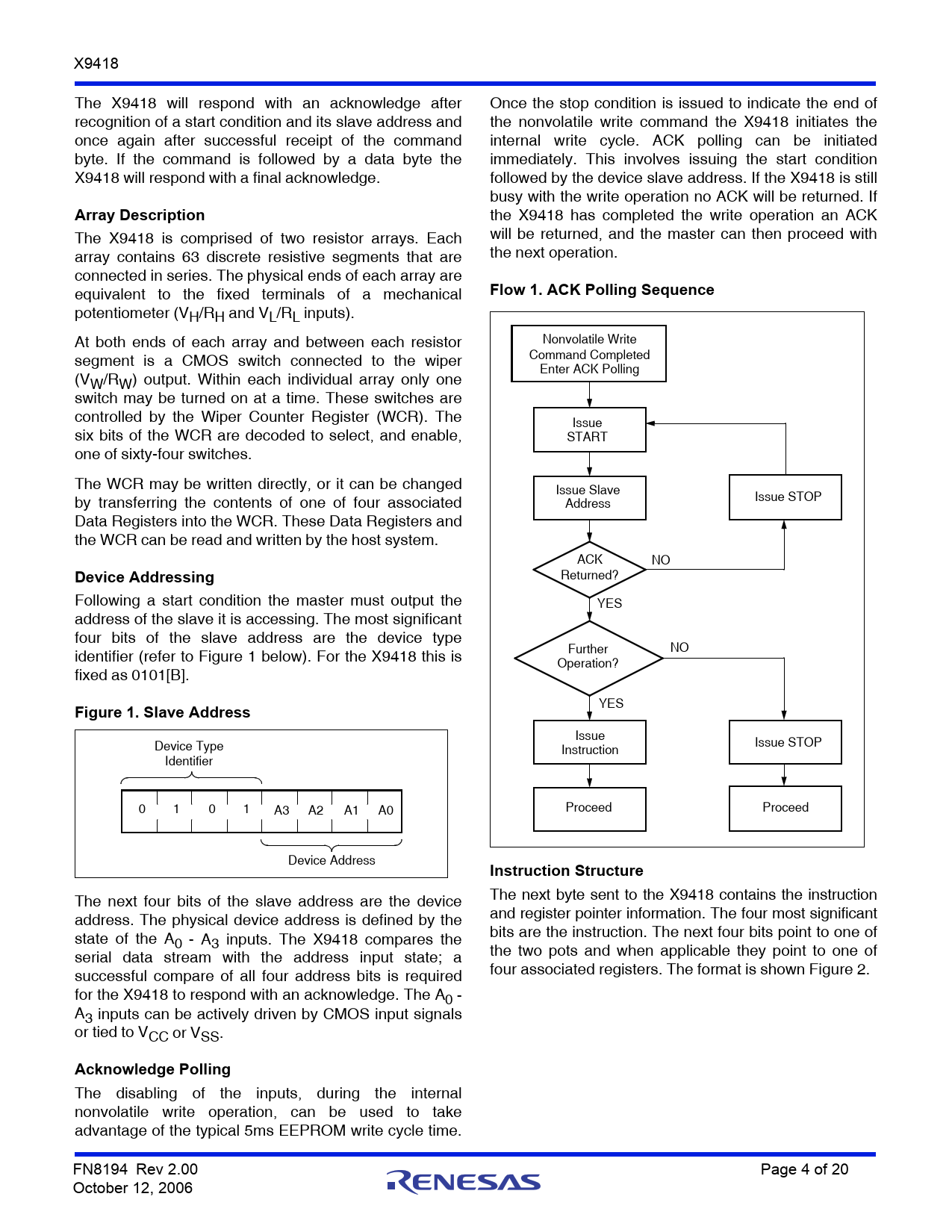 link to page 5 X9418 The X9418 will respond with an acknowledge after Once the stop condition is issued to indicate the end of recognition of a start condition and its slave address and the nonvolatile write command the X9418 initiates the once again after successful receipt of the command internal write cycle. ACK polling can be initiated byte. If the command is followed by a data byte the immediately. This involves issuing the start condition X9418 will respond with a final acknowledge. followed by the device slave address. If the X9418 is still busy with the write operation no ACK will be returned. If