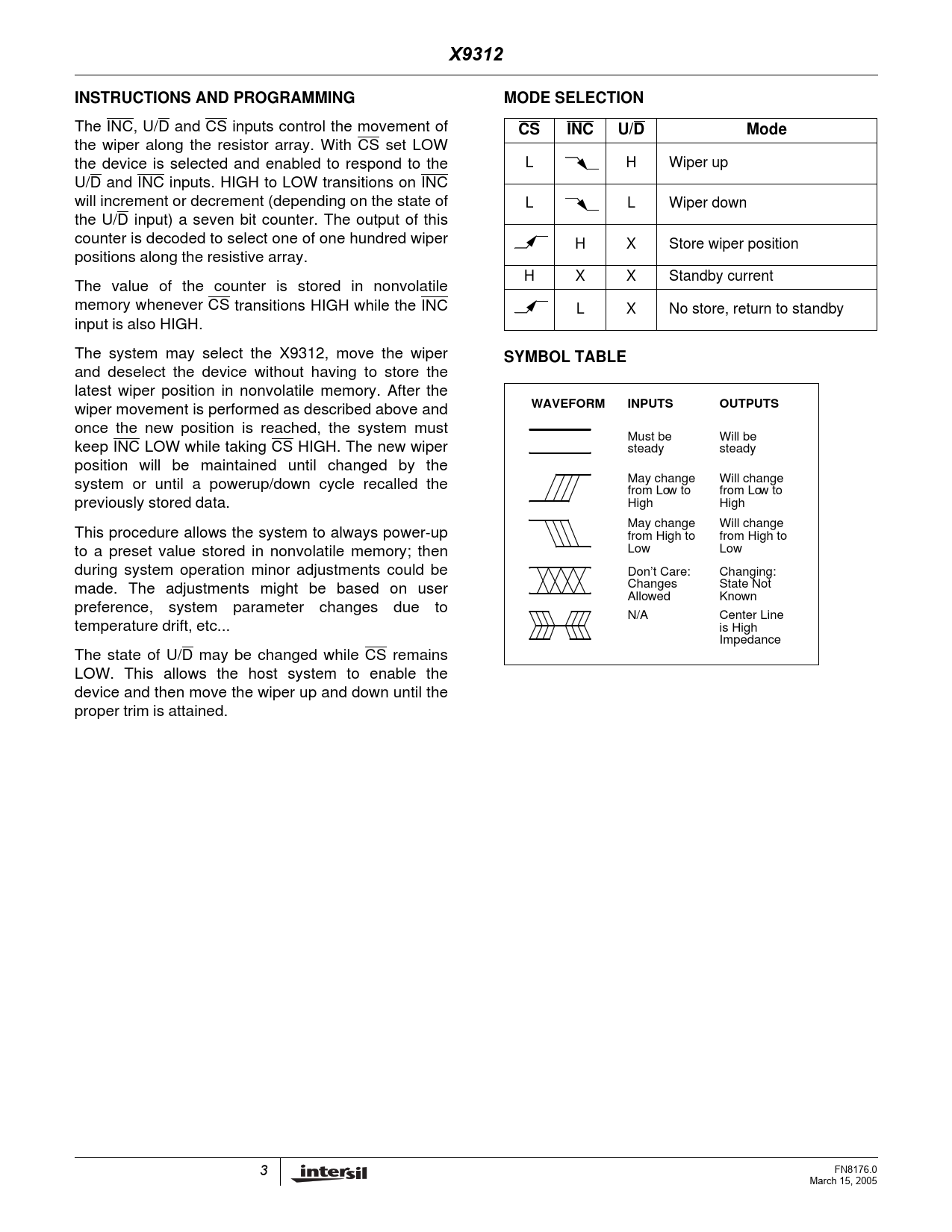 X9312INSTRUCTIONS AND PROGRAMMINGMODE SELECTION The INC, U/D and CS inputs control the movement of CSINCU/DMode the wiper along the resistor array. With CS set LOW the device is selected and enabled to respond to the L H Wiper up U/D and INC inputs. HIGH to LOW transitions on INC will increment or decrement (depending on the state of L L Wiper down the U/D input) a seven bit counter. The output of this counter is decoded to select one of one hundred wiper H X Store wiper position positions along the resistive array. H X X Standby current The value of the counter is stored in nonvolatile memory whenever CS transitions HIGH while the INC L X No store, return to standby input is also HIGH. The system may select the X9312, move the wiper SYMBOL TABLE and deselect the device without having to store the latest wiper position in nonvolatile memory. After the wiper movement is performed as described above and WAVEFORMINPUTSOUTPUTS once the new position is reached, the system must Must be Will be keep INC LOW while taking CS HIGH. The new wiper steady steady position will be maintained until changed by the system or until a powerup/down cycle recalled the May change Will change from Low to from Low to previously stored data. High High May change Will change This procedure allows the system to always power-up from High to from High to to a preset value stored in nonvolatile memory; then Low Low during system operation minor adjustments could be Don’t Care: Changing: made. The adjustments might be based on user Changes State Not Allowed Known preference, system parameter changes due to N/A Center Line temperature drift, etc... is High Impedance The state of U/D may be changed while CS remains LOW. This allows the host system to enable the device and then move the wiper up and down until the proper trim is attained. 3 FN8176.0 March 15, 2005